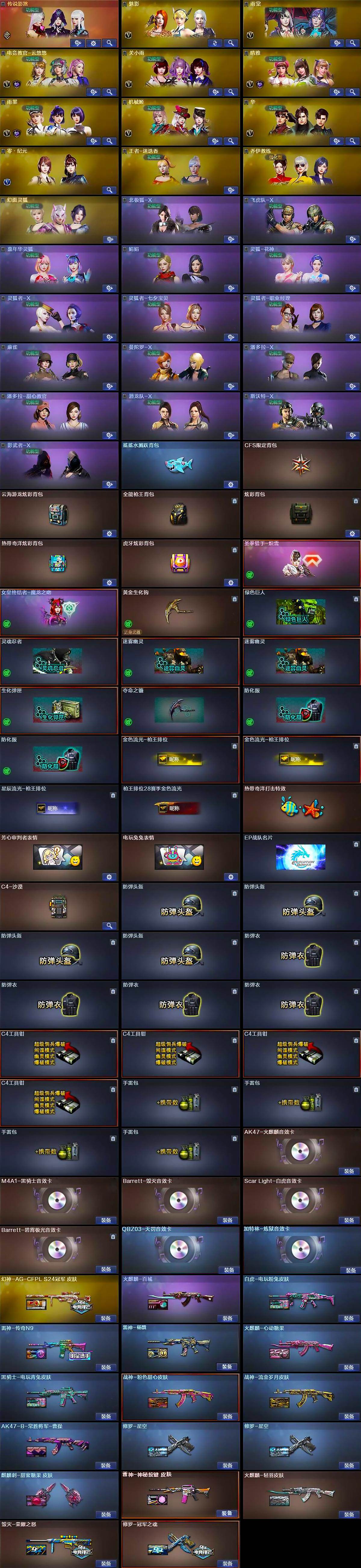【音效卡】:AK47-火麒麟音效卡,M4A1-黑骑士音效卡,Barrett-毁灭音效卡,Scar Light-白虎音效卡,QBZ03-天罚音效卡,加特林-炼狱音效卡,Barrett-碧霄极光音效卡