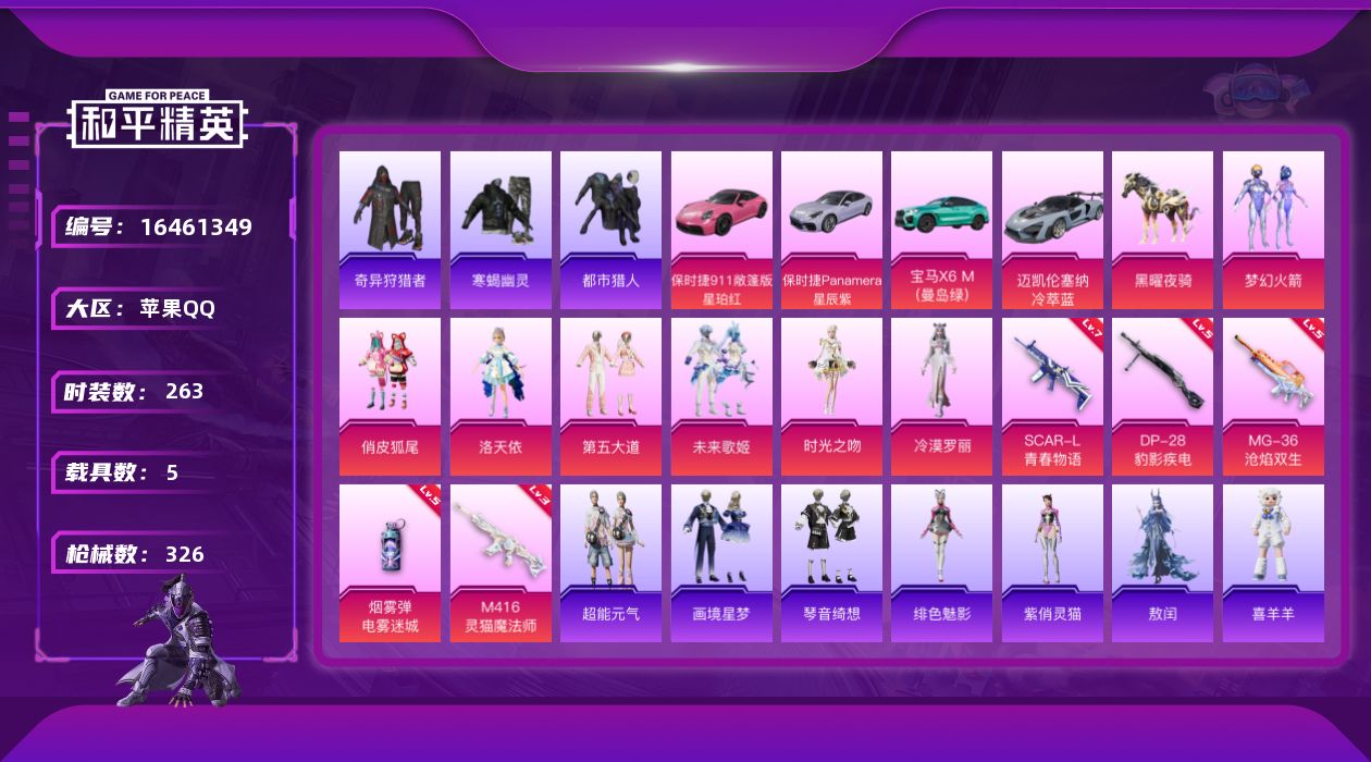 [16461349]苹果 手Q-7粉装-5特效枪-5载具-6粉色飞行器-107084热力值-16王牌印记-263套装-326枪皮