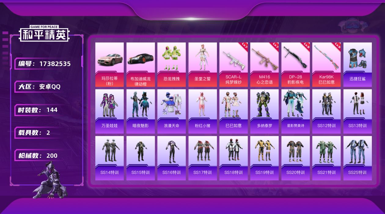 - PX_2093211- 苹果手Q-4王牌印记-4粉装-9特效枪-0载具-34895热力值-92套装-108枪皮-1卓越印记-0传奇印记 【4粉装】,霓裳武神,赤焰黑爵,萨利娅,创世·救赎 【9特效枪】SCAR-L-锦绣绵绵-5级 M416-女娲灵识-3级 M416-电玩时刻-5级 GROZA-镜光银凌-5级 AUG-暖羊咩咩-4级 M762-青锋波束-5级 Kar98K-巳巳如意-5级 Mk14-