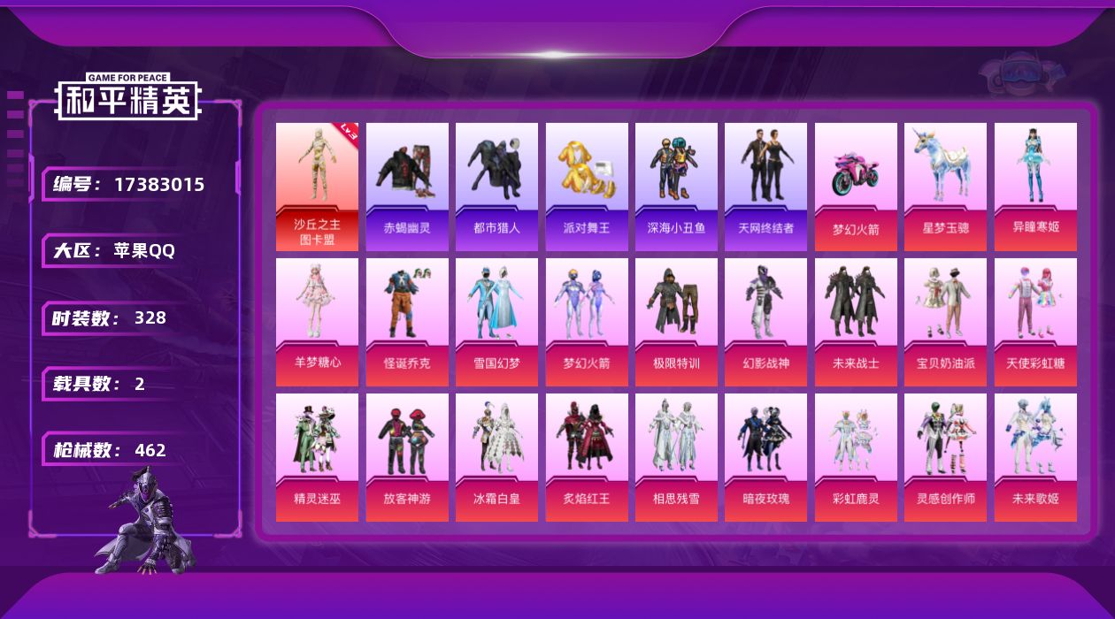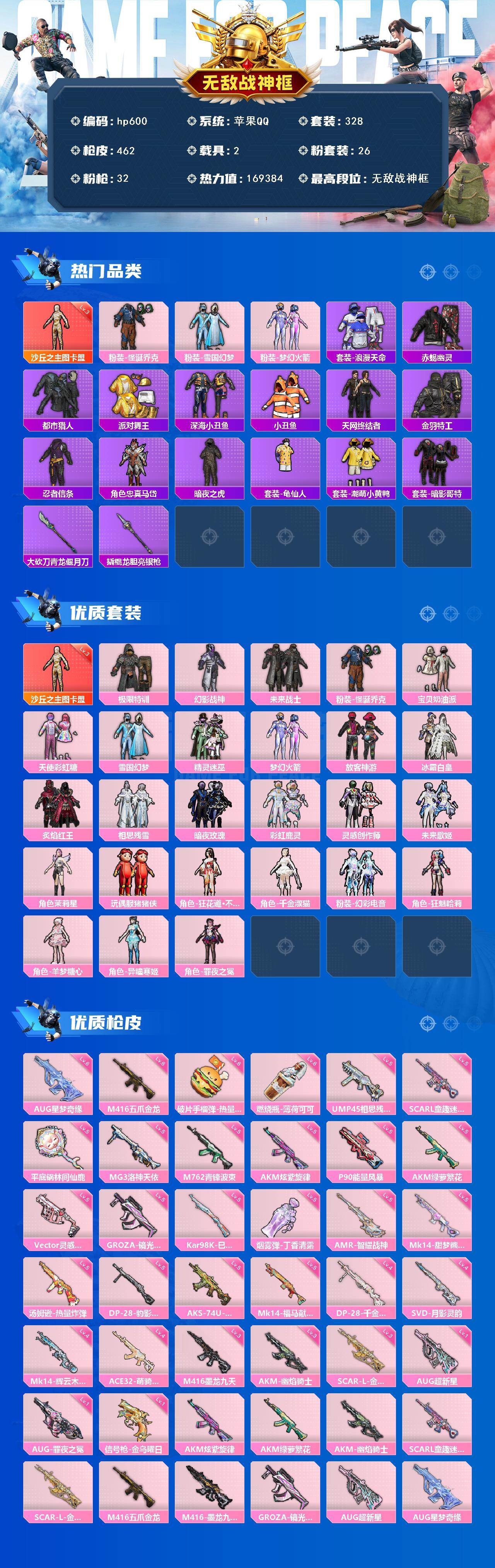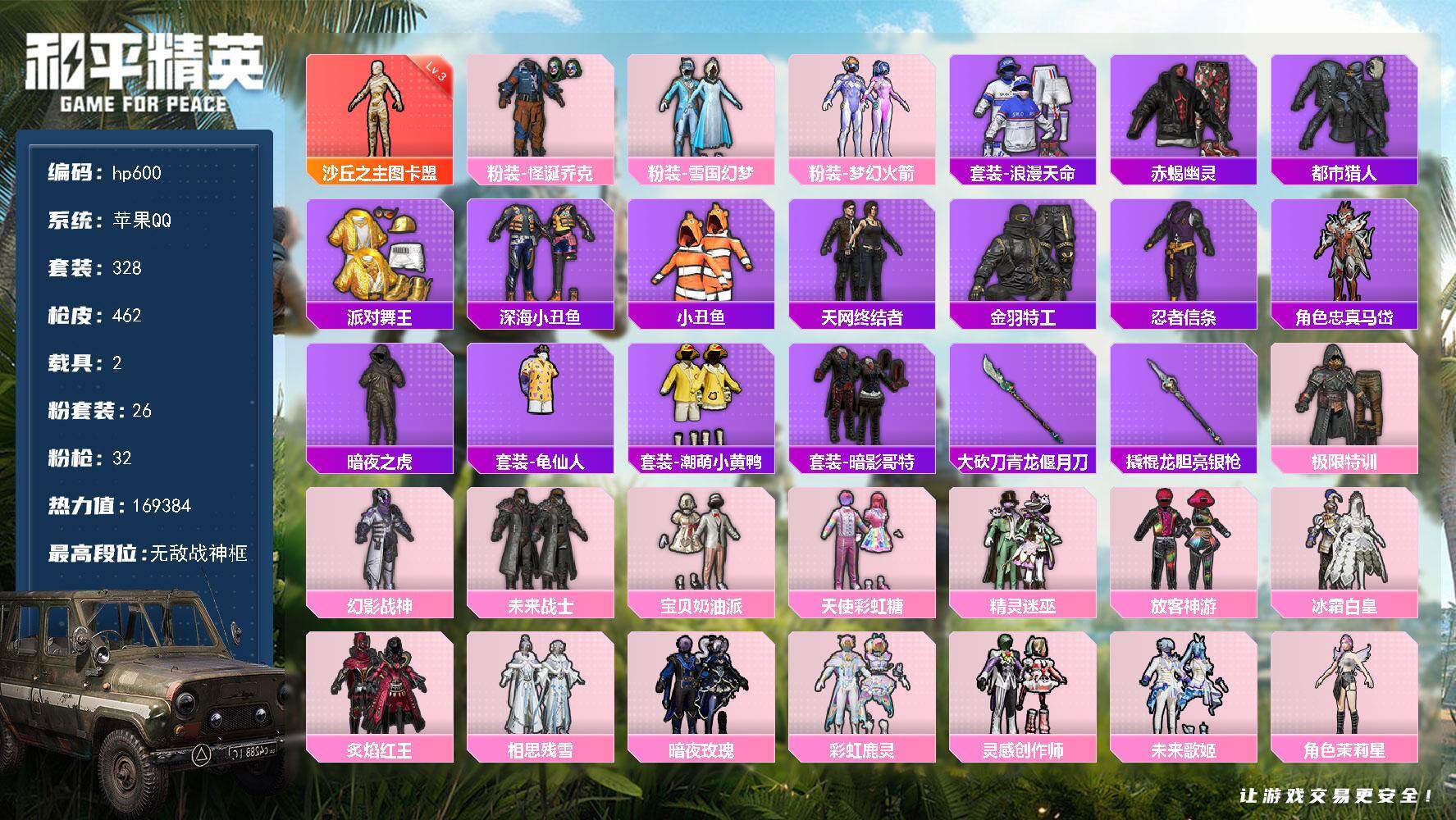 [17383015]苹果 手Q-无敌战神框-1神装-26粉装-32特效枪-2载具-21粉色飞行器-169384热力值-22王牌印记-328套装-462枪皮