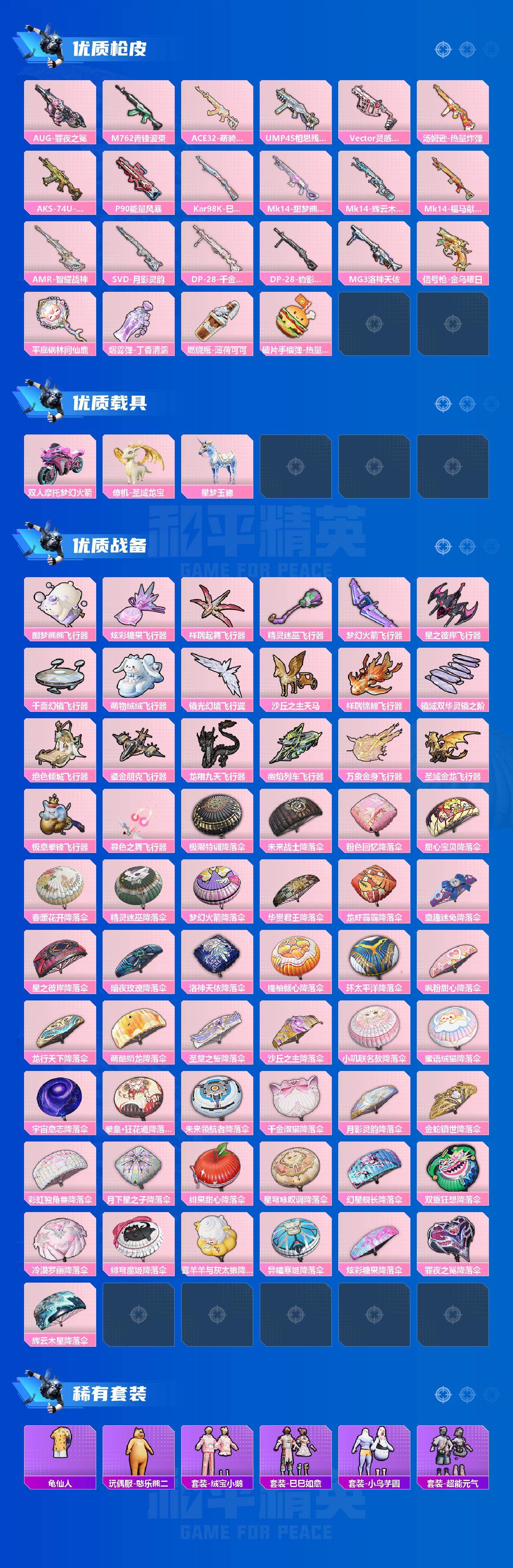 - [17935641]安卓 手Q-3粉装-12特效枪-0载具-1粉色飞行器-56875热力值-7王牌印记-131套装-212枪皮 【热门品类】:套装-龟仙人,套装-暗影哥特 【粉色套装】:角色-绝对恒星,粉装-幻彩电音,角色-异瞳寒姬 【粉色枪皮等级】:M416-电玩时刻(五级),GROZA-镜光银凌(五级),AUG-暖羊咩咩(五级),AUG-花中眠(三级),UMP45-量子极限(五级),Kar98K-巳巳如意(五级),Mk14-甜梦熊击(五级),Mk14-福马献瑞(五级),AA12-G-萌骑幻想(一级),DP-28-豹影疾电(五级),信号枪-金乌曜日(三级),破片手榴弹-美味星星糖(七级) 【粉色枪皮】:M416-电玩时刻,GROZA-镜光银凌,AUG-暖羊咩咩,AUG-花中眠,UMP45-量子极限,Kar98K-巳巳如意,Mk14-甜梦熊击,Mk14-福马献瑞,AA12-G-萌骑幻想,DP-28-豹影疾电,信号枪-金乌曜日,破片手榴弹-美味星星糖 【粉色飞行器】:炫彩糖果飞行器 【粉色降落伞】:绝对恒星降落伞,星之彼岸降落伞,仲夏莫吉托降落伞,鸢尾晶梦降落伞,守护天翼降落伞,金丰海韵降落伞,幻彩电音降落伞,绯穹魔姬降落伞,异瞳寒姬降落伞,炫彩糖果降落伞,罪夜之冕降落伞 【稀有套装】:套装-龟仙人,套装-巳巳如意,角色-甜心蒙太奇,套装-雪国风尚,套装-炫彩糖果,角色-X,套装-马上有钱,套装-雏菊兔兔,套装-萝兰蝴蝶,套装-燕燕于飞,套装-鱼渊荷华,角色-蜜桃派对,套装-紫幽梦,套装-蓝冰羽,套装-极速光影,套装-彩虹兔,套装-云朵鹅,套装-雪绒豹,角色-夜瞳黯灵,套装-朱霞炽焰,套装-凌霄紫焰,套装-擎苍青焰,角色-绯色魅影,角色-紫俏灵猫,套装-书海巡游,套装-画境星梦,套装-琴音绮想,套装-雨过天青,套装-红釉青花 【稀有枪皮】:AUG-冰晶雪宝,AKM-星之彼岸,AKM-生命誓言,AKM-破晓战魂,AKM-虎虎生威,AKM-龙的传人,M16A4-幻世战舞者,SCAR-L-夜灯,SCAR-L-炫彩节奏,SCAR-L-红色方程式,M416-糯团青竹,M416-红色方程式,M416-诡夜天鹅,AUG-天降萌叽,AUG-甜蜜菠萝,AUG-耀粉歌者,AUG-绝对恒星,QBZ-彩虹符号,QBZ-银碳小老虎,M762-天降萌叽,M762-彩虹符号,M762-云朵鹅,M762-登顶巅峰,M