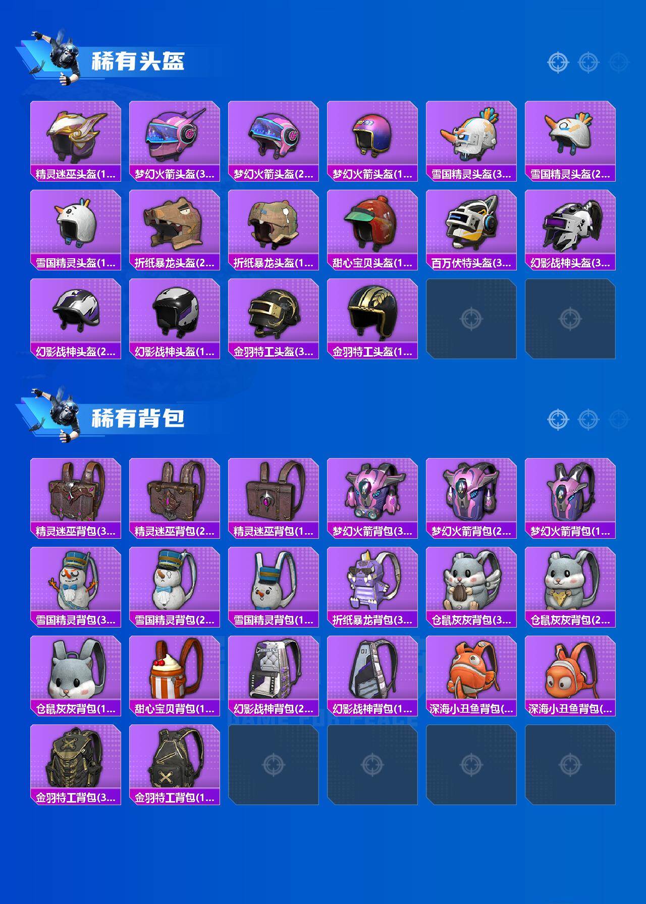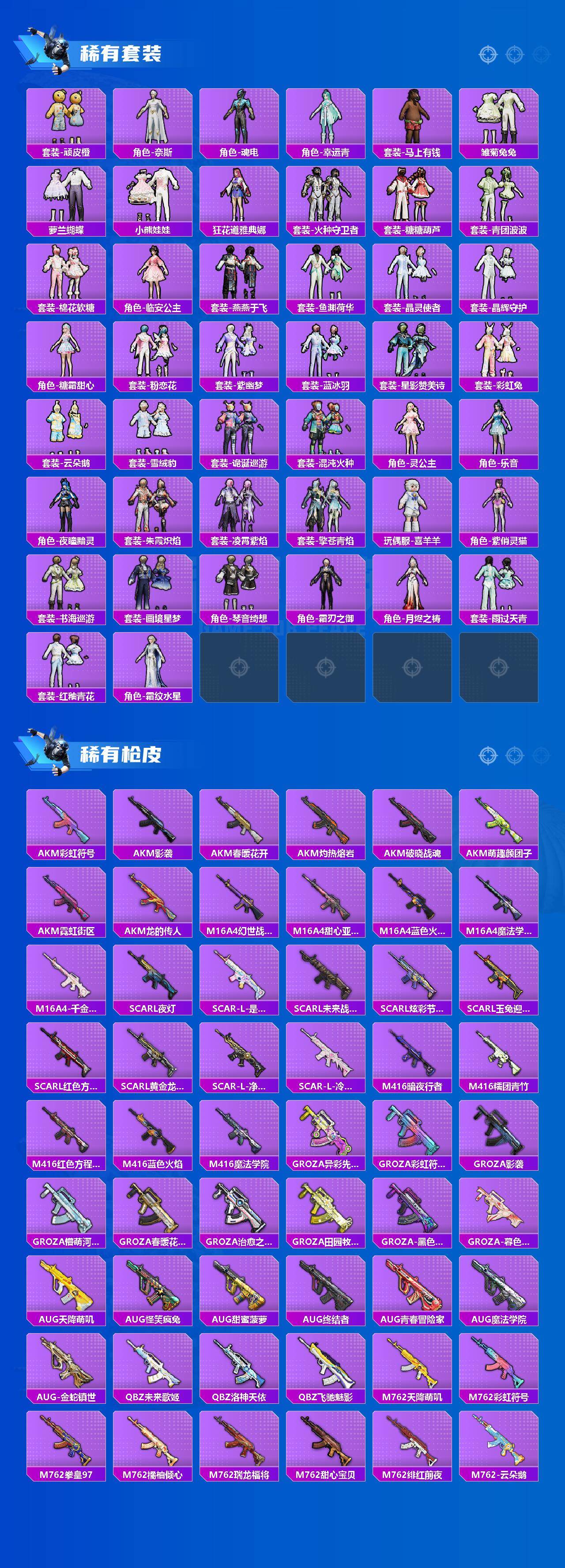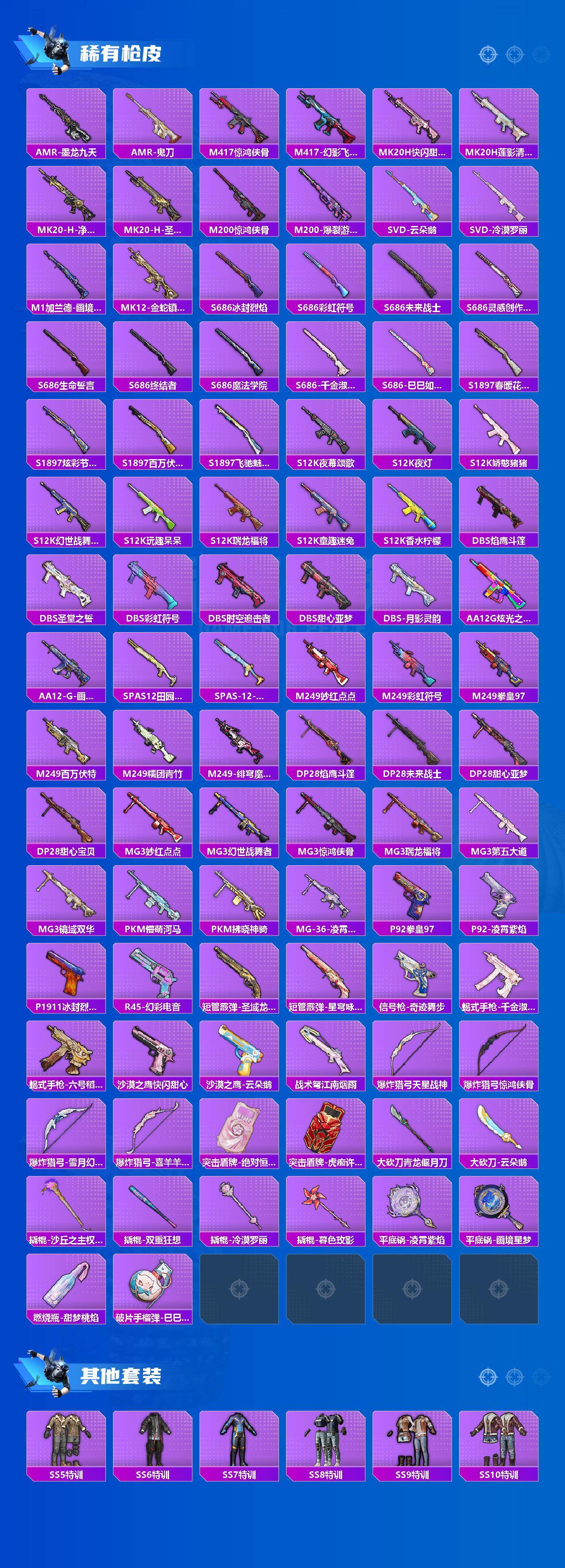 AKM-炫紫旋律,AKM-绿萝繁花,AKM-幽焰骑士,SCAR-L-童趣迷兔,SCAR-L-金蛇镇世,M416-五爪金龙,M416-墨龙九天,GROZA-镜光银凌,AUG-超新星,AUG-星梦奇缘,M762-青锋波束,UMP45-相思残雪,Vector-灵感创作师,P90-能量风暴,Kar98K-巳巳如意,SVD-月影灵韵,DP-28-千金淑猫,MG3-洛神天依,平底锅-林间仙鹿,烟雾弹-丁香清露,破片手榴弹-热量炸弹