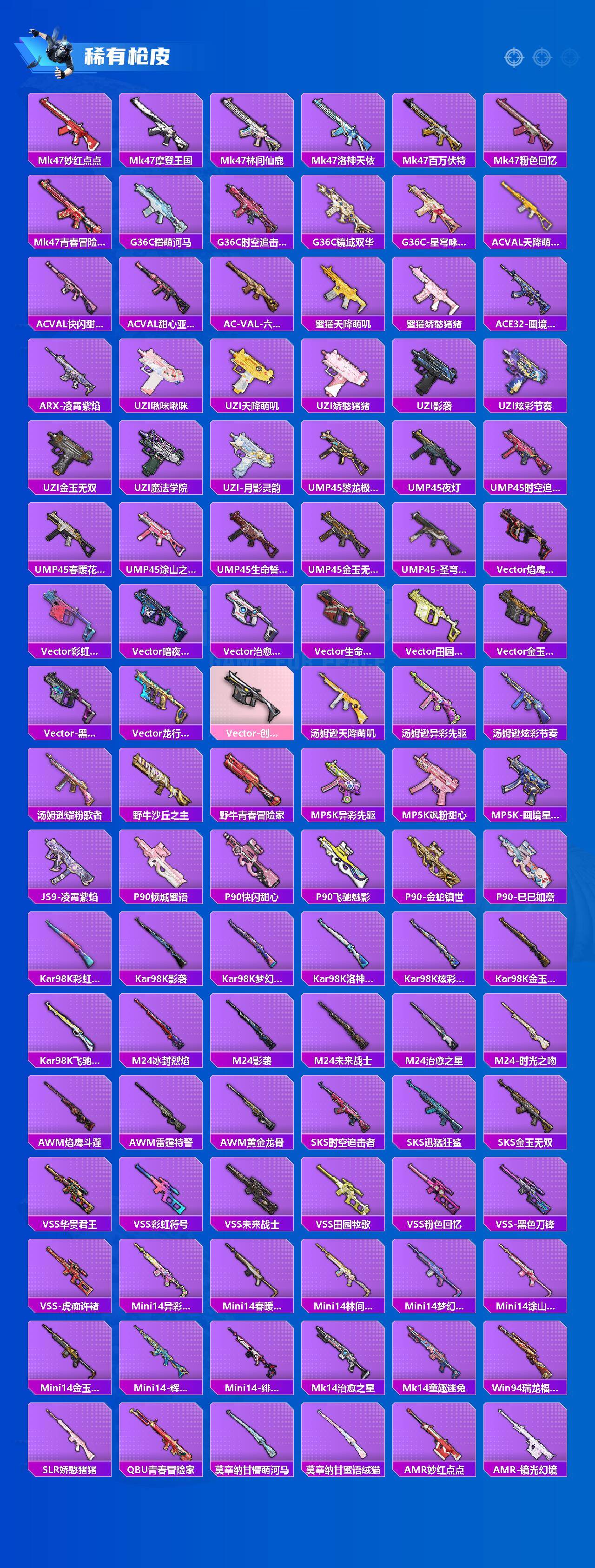 【粉色枪皮等级】:AKM-炫紫旋律(五级),AKM-绿萝繁花(五级),AKM-幽焰骑士(三级),SCAR-L-童趣迷兔(五级),SCAR-L-金蛇镇世(三级),M416-五爪金龙(六级),M416-墨龙九天(三级),GROZA-镜光银凌(五级),AUG-超新星(一级),AUG-星梦奇缘(六级),AUG-罪夜之冕(一级),M762-青锋波束(五级),ACE32-萌骑漫游(四级),UMP45-相思残雪(五级),Vector-灵感创作师(五级),汤姆逊-热量炸弹(五级),AKS-74U-森灵之息(五级),P90-能量风暴(五级),Kar98K-巳巳如意(五级),Mk14-甜梦熊击(五级),Mk14-辉云木星(四级),Mk14-福马献瑞(五级),AMR-智耀战神(五级),SVD-月影灵韵(四级),DP-28-千金淑猫(四级),DP-28-豹影疾电(五级),MG3-洛神天依(五级),信号枪-金乌曜日(一级),平底锅-林间仙鹿(五级),烟雾弹-丁香清露(五级),燃烧瓶-薄荷可可(六级),破片手榴弹-热量炸弹(六级)