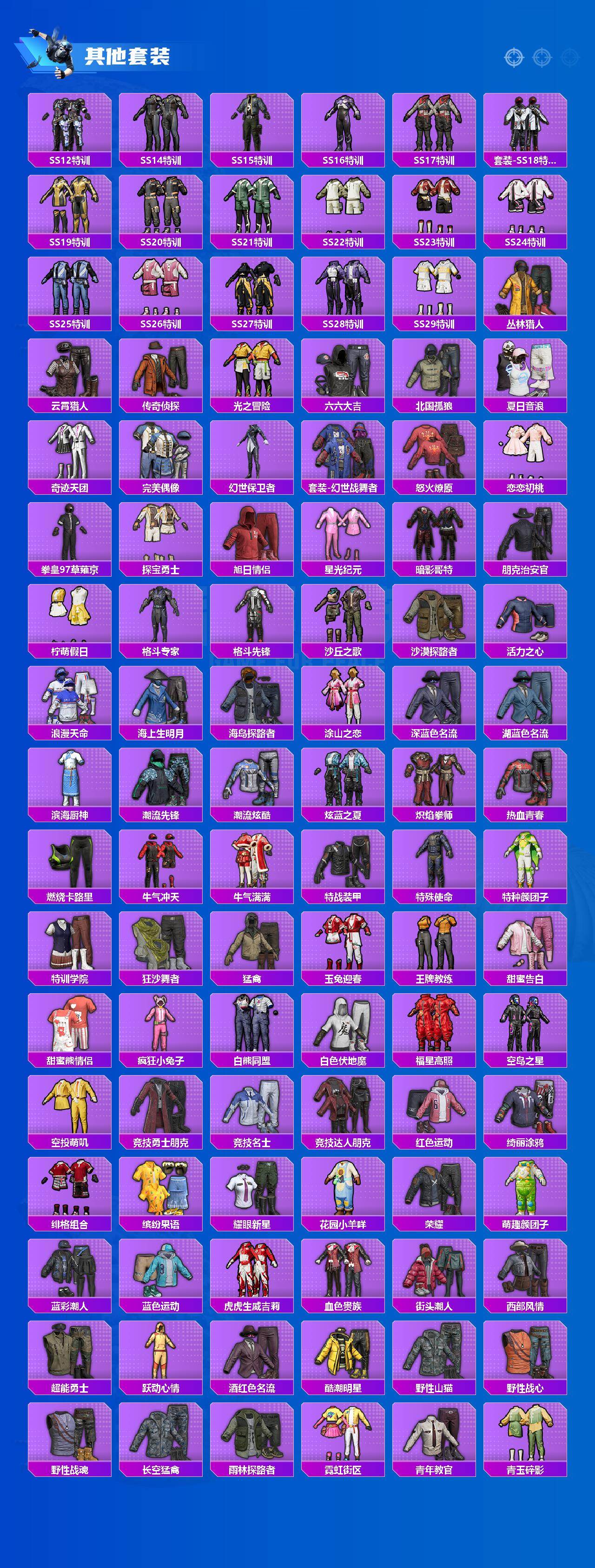 【粉色套装】:粉装-极限特训,粉装-幻影战神,粉装-未来战士,粉装-怪诞乔克,粉装-宝贝奶油派,粉装-天使彩虹糖,粉装-雪国幻梦,粉装-精灵迷巫,粉装-梦幻火箭,粉装-放客神游,粉装-冰霜白皇,粉装-炙焰红王,粉装-相思残雪,粉装-暗夜玫瑰,粉装-彩虹鹿灵,粉装-灵感创作师,粉装-未来歌姬,角色-茉莉星,玩偶服-猪猪侠,角色-狂花道·不知火舞,角色-千金淑猫,粉装-幻彩电音,角色-狂魅哈莉,角色-羊梦糖心,角色-异瞳寒姬,角色-罪夜之冕