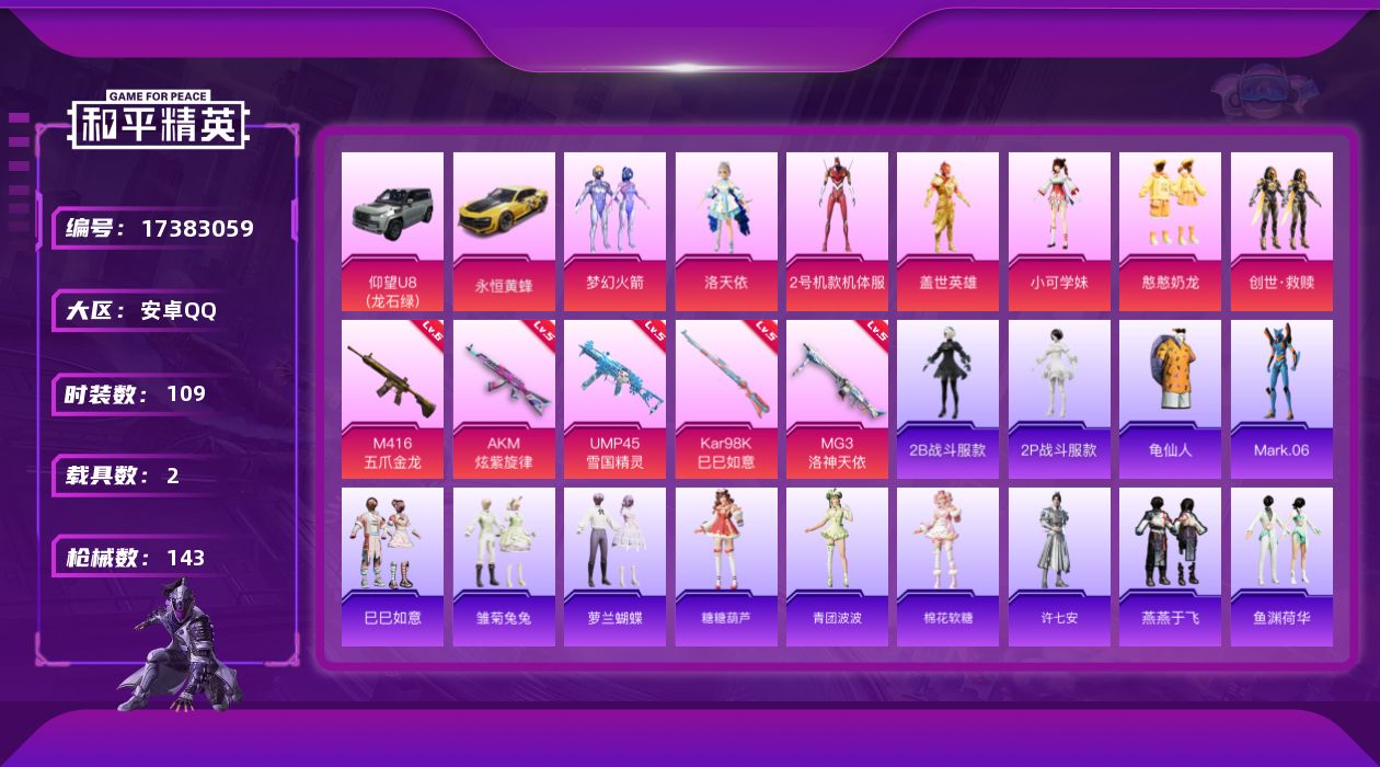 安卓 手Q-7粉装-5特效枪-2载具-3粉色飞行器-49440热力值-6王牌印记-109套装-143枪皮【热门品类】:粉装-梦幻火箭,角色-2B战斗服款,角色-2P战斗服款,套装-龟仙人,角色-Mark.06【粉色套装】:粉装-梦幻火箭,角色-洛天依,角色-2号机款机体服,粉装-盖世英雄,角色-小可学妹,粉装-憨憨奶龙,套装-创世·救赎【粉色枪皮等级】:AKM-炫紫旋律(五级),M416-五爪金龙(六级),UMP45-雪国精灵(五级),Kar98K-巳巳如意(五级),MG3-洛神天依(五级)【粉色载具】:仰望U8(龙石绿),永恒黄蜂【粉色枪皮】:AKM-炫紫旋律,M416-五爪金龙,UMP45-雪国精灵,Kar98K-巳巳如意,MG3-洛神天依【粉色飞行器】:深海曼妙飞行器,梦幻火箭飞行器,星夜魔法师飞行翼