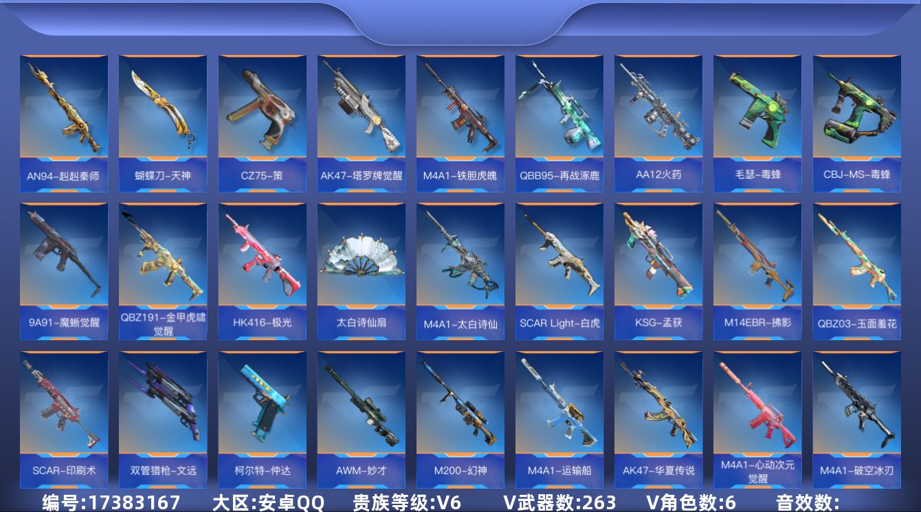 [17383167]【店主推荐捡漏号!可直接换绑】6英雄角色数-263英雄武器数-7王者武器/8热门 【王者系列】:王者之影,王者之心,王者之锋,王者之魂,王者之霆,王者之技,M12S-雷霆王者 【热门武器】:KSG-孟获,81式-光明之神,M200-幻神,AWM-妙才,81式-阿波罗,CZS2-仲康,AN94-盖 【角色】:幽灵刀锋-觉醒,樱,九尾狐,炽天使-X,零-新生,钟小魁 【英雄武器】:AK47-无影,AK47-火麒麟*3,AK47-黑武士,AK47-黑武士觉醒,AK47-机械迷城,AK47-猩红传说,AK47-血武士,AK47-华夏传说,AK47-黑鲨,AK47-木兰*2,AK47-塔罗牌觉醒,AK47-谜城烟火*2,M4A1-雷神,M4A1-黑骑士,M4A1-黑龙,M4A1-死神*2,M4A1-龙血,M4A1-海骑士,M4A1-破空冰刃,M4A1-堕天神,M4A1-心动次元觉醒,M4A1-运输船,M4A1-猎神,M4A1-太白诗仙,M4A1-铁胆虎魄,SCAR-幽暗骑士觉醒,SCAR Light-白虎,SCAR-探星者,SCAR-印刷术,SCAR-心动PICK,AN94-卷帘大将军,AN94-赳赳秦师,AN94-盖,AUG-机械纪元,9A91-天神,9A91-魔蜥觉醒,M14EBR-天神,M14EBR-拂影*2,M14EBR-葫芦山庄,AK12-天启,QBZ03-金色蔷薇,QBZ03-死神,QBZ03-玉面羞花,HK416-极光,HK417-炎龙铠甲,81式-光明之神,MK47-云舞,G3A3-衍神兵,QBZ97-浩瀚征途,QBZ191-金甲虎啸觉醒,QBZ191-封神榜,AWM-天龙,AWM-妙才,AWM-裁决,AWM-天使,AWM-指南针觉醒,AWM-大湾溢彩,巴雷特-毁灭*3,巴雷特-极光*6,M200-幻神,M200-心动次元觉醒,09式狙-天神*3,98K-黑骑士,98K-血月,98K-星神,RPK-盘龙,加特林-堡垒,加特林-堡垒觉醒,加特林-蟒蛇,QBB95-极光,QBB95-再战涿鹿,MK5-极光,寒霜烈龙*4,双持斯泰尔-天使,QCW05-孟婆,CBJ-MS-毒蜂,CZS2-血月,CZS2-仲康,M12S-天公,DDM4-PDW-星际宇航觉醒,地狱火,地狱烈炎,AA12-火药,KSG-极光,KSG-孟获,KSG-钟馗觉醒,Origin12-机变奇蛇觉醒