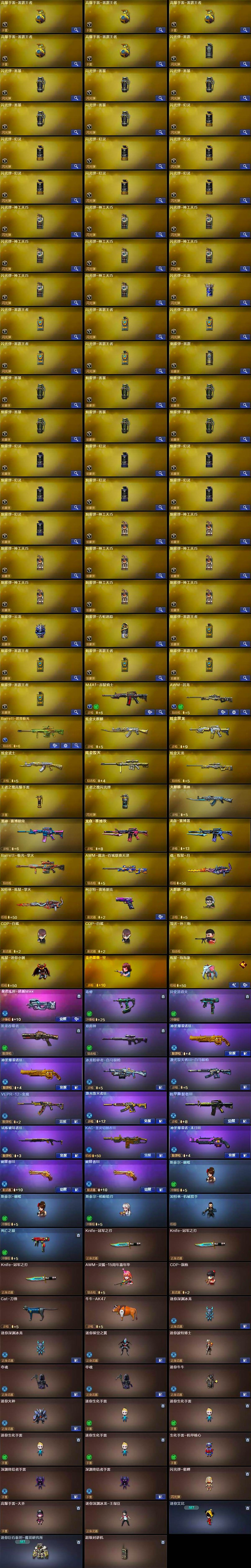 【热门武器】:传说梦魇,传说夜影,传说灵眸,传说破晓,G36C-幻影,QBZ03-金色蔷薇*2,M14EBR-玄武,Scar Light-白虎*2,HK417-朱雀,M4A1-青龙,M200-幻神*2,金色蔷薇-古蛇迷踪,修罗-古蛇迷踪,死亡之眼,青龙之魄,柯尔特-冠军之特*2,荣耀世冠-柯尔特,Kar98K-星神,金色小号,Cat-刀锋,炼狱-迷你小钢,毒蜂,牛牛-AK47,M4A1-黑骑士*2,汤姆逊-烈龙*5,RPK-盘龙*6,加特林-炼狱*2,金色蔷薇-空,斯泰尔-蝴蝶*2,炼狱-泡泡象,降世魔童,毁灭-孙三炮,火麒麟-绝迹,COP-白鲨*2,USP-雷暴,COP 357-幻灵*4,沙鹰-修罗*5,柯尔特-赛博朋克,Knife-冠军之刃*3,炽芒蝶刃*3,炽芒蝶刃-冠军炽芒皮肤,荣耀世冠-龙啸,黄金猫猫手套-白鲨,金刚伞
