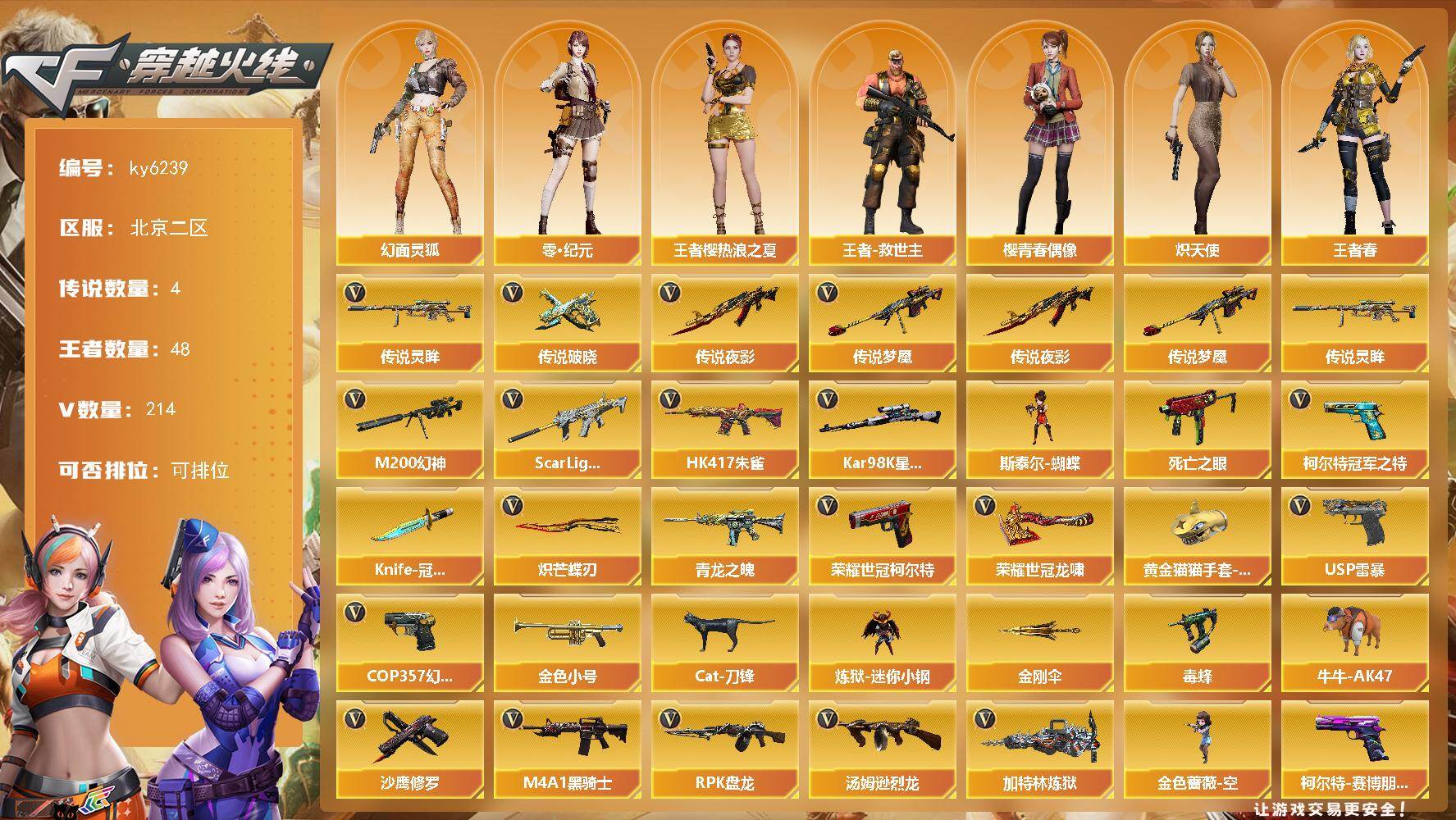 [17383588]北京二区-245V-48王者武器数-5炫金武器数 【传说武器】:传说夜影,传说梦魇,传说灵眸,传说破晓 【传说角色】:传说艾莉莎,传说影煞 【热门武器】:传说梦魇,传说夜影,传说灵眸,传说破晓,G36C-幻影,QBZ03-金色蔷薇*2,M14EBR-玄武,Scar Light-白虎*2,HK417-朱雀,M4A1-青龙,M200-幻神*2,金色蔷薇-古蛇迷踪,修罗-古蛇迷踪,死亡之眼,青龙之魄,柯尔特-冠军之特*2,荣耀世冠-柯尔特,Kar98K-星神,金色小号,Cat-刀锋,炼狱-迷你小钢,毒蜂,牛牛-AK47,M4A1-黑骑士*2,汤姆逊-烈龙*5,RPK-盘龙*6,加特林-炼狱*2,金色蔷薇-空,斯泰尔-蝴蝶*2,炼狱-泡泡象,降世魔童,毁灭-孙三炮,火麒麟-绝迹,COP-白鲨*2,USP-雷暴,COP 357-幻灵*4,沙鹰-修罗*5,柯尔特-赛博朋克,Knife-冠军之刃*3,炽芒蝶刃*3,炽芒蝶刃-冠军炽芒皮肤,荣耀世冠-龙啸,黄金猫猫手套-白鲨,金刚伞 【王者炫金武器】:青龙之魄,王者雷怒,王者星霆,USP-雷暴王者,炫金火麒麟,炫金黑龙,炫金武士,炫金毁灭,炫金天龙,王者之魄高爆手雷,王者之魄闪光弹 【音效卡】:屠龙-动感闪耀 音效卡,M200-幻神音效卡,M4A1-雷神音效卡,M4A1-黑骑士音效卡,Barrett-毁灭音效卡,Barrett-极光音效卡,QBZ03-金色蔷薇音效卡,AWM-裁决音效卡,Scar Light-白虎音效卡,绝迹语音包,N9语音包,宋雨琦语音包,加特林-炼狱音效卡,Barrett-碧霄极光音效卡,AWM-昌龙-怀旧音效卡,火线妹语音包 【皮肤】:M200-幻神-黄忠皮肤,幻神-周瑜皮肤,幻神-冠军之幻,幻神-宠儿-2021MVP,M200-幻神-荣耀世冠白鲨*2,M200-幻神-N9-2022MVP,幻神-动感闪耀 皮肤,幻神-纸灯龙皮肤,幻神-KZ-CFPLS25冠军 皮肤,白虎-大汉风骨,白虎-霓虹机甲 皮肤,ScarLight-白虎-冠军之虎皮肤,QBZ03-冠军之薇,QBZ03-AG-CFPLS19冠军,QBZ03-荣耀世冠白鲨,金色蔷薇-纸灯龙皮肤,QBZ03-巅峰荣耀皮肤*2,裁决-流光秘银,裁决-星际旅行 皮肤,星神-漫游,Kar98K-星神-冠军之星皮肤,烈龙-星空,雷神-暗月,雷神-荣耀之魄,雷神-虎