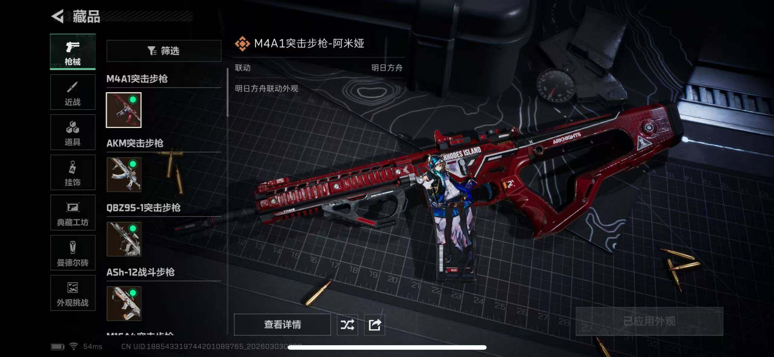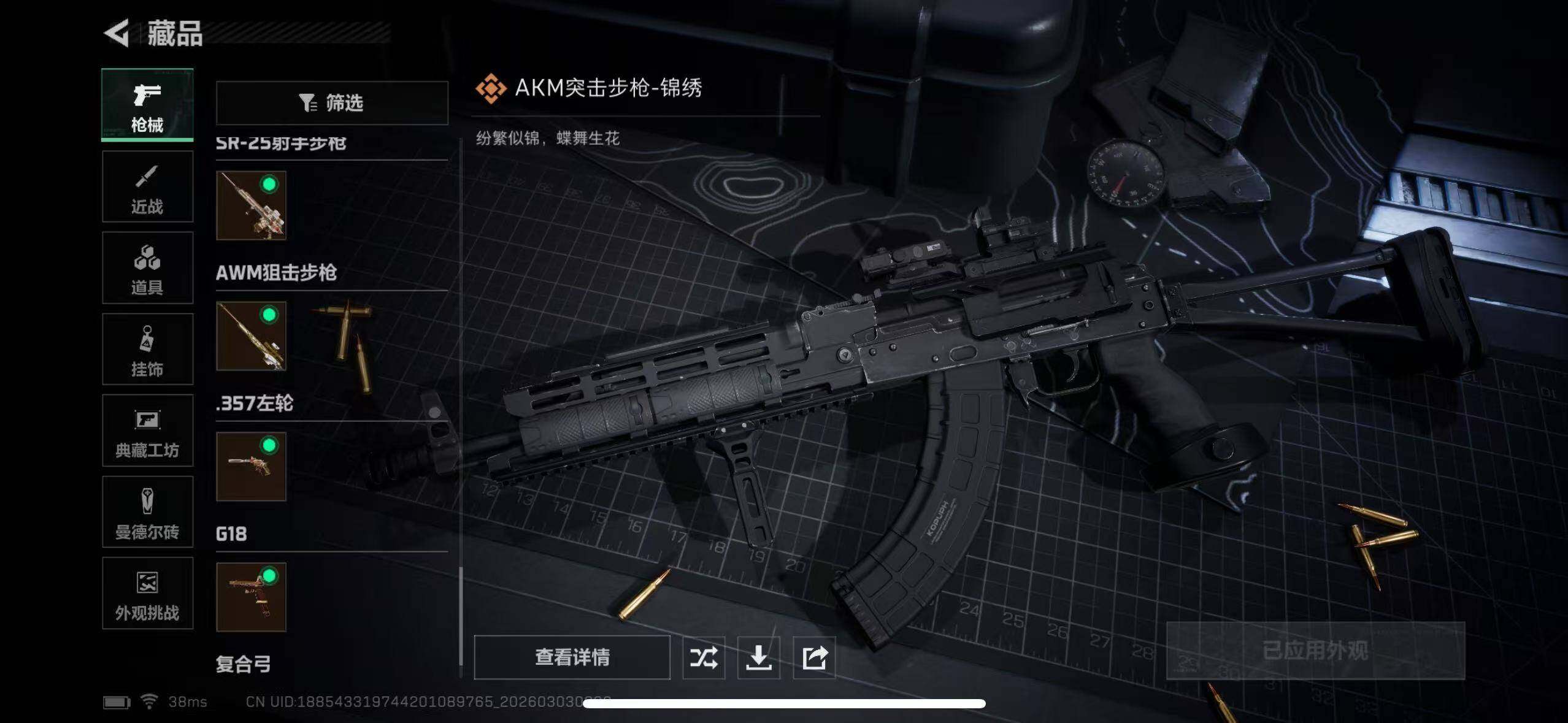 【传说外观】:M4A1突击步枪-阿米娅,AKM突击步枪-锦绣,QBZ95-1突击步枪-凌霄戍卫,ASh-12战斗步枪-鹅鸭杀,M16A4突击步枪-狩猎时刻,AK-12突击步枪-特斯拉线圈,SCAR-H战斗步枪-启航,G3战斗步枪-狩猎时刻,G3战斗步枪-骑士,CAR-15突击步枪-阿米娅,腾龙突击步枪-马年祥瑞,K437突击步枪-锦绣,KC17突击步枪-电锯惊魂,Vector冲锋枪-狩猎时刻,UZI冲锋枪-特斯拉线圈,SMG-45冲锋枪-锦绣,SR-3M紧凑突击步枪-特斯拉线圈,勇士冲锋枪-能天使-午夜邮差,QCQ171冲锋枪-鹅鸭杀,725双管霰弹枪-送葬人-无题密令,QJB201轻机枪-鹅鸭杀,M14射手步枪-缄花,SKS射手步枪-骑士,SR-25射手步枪-缄花,AWM狙击步枪-万金泪冠,.357左轮-缄花,G18-马年祥瑞,复合弓-黑·天际线