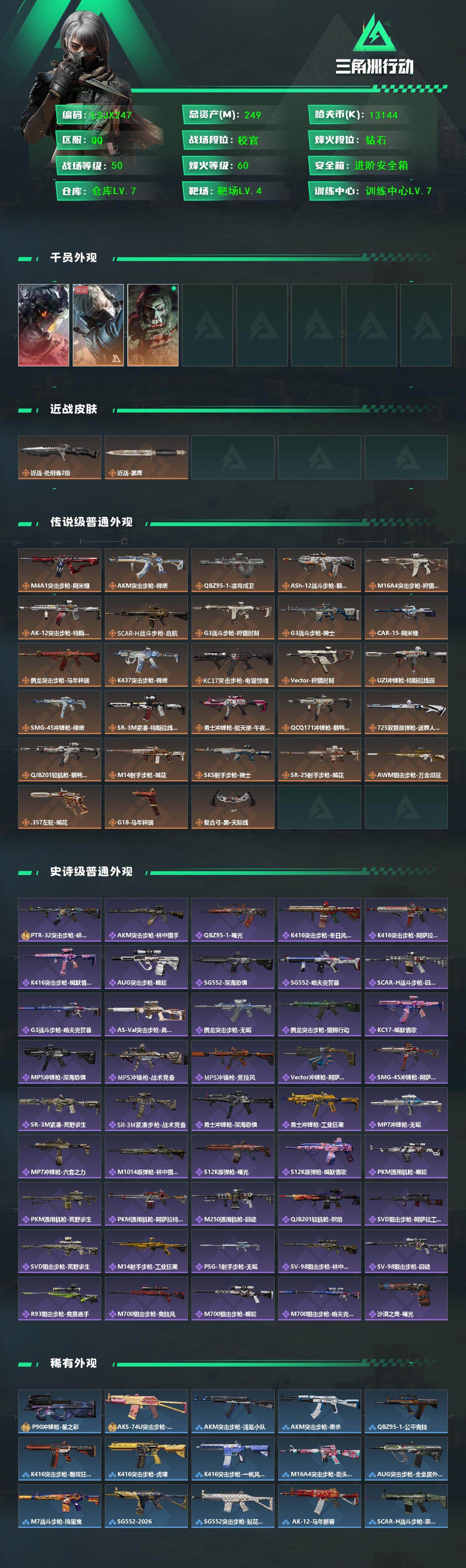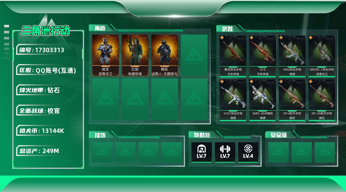[17303313]【特价出售/店主推荐】249m总资产-13144k哈伏币-60烽火等级-钻石-50战场等级-校官 【干员外观】:威龙-凌霄戍卫,蜂医-送葬人·无题密令,红狼-电锯惊魂 【近战皮肤】:近战-处刑者2级,近战-黑鹰 【传说外观】:M4A1突击步枪-阿米娅,AKM突击步枪-锦绣,QBZ95-1突击步枪-凌霄戍卫,ASh-12战斗步枪-鹅鸭杀,M16A4突击步枪-狩猎时刻,AK-12突击步枪-特斯拉线圈,SCAR-H战斗步枪-启航,G3战斗步枪-狩猎时刻,G3战斗步枪-骑士,CAR-15突击步枪-阿米娅,腾龙突击步枪-马年祥瑞,K437突击步枪-锦绣,KC17突击步枪-电锯惊魂,Vector冲锋枪-狩猎时刻,UZI冲锋枪-特斯拉线圈,SMG-45冲锋枪-锦绣,SR-3M紧凑突击步枪-特斯拉线圈,勇士冲锋枪-能天使-午夜邮差,QCQ171冲锋枪-鹅鸭杀,725双管霰弹枪-送葬人-无题密令,QJB201轻机枪-鹅鸭杀,M14射手步枪-缄花,SKS射手步枪-骑士,SR-25射手步枪-缄花,AWM狙击步枪-万金泪冠,.357左轮-缄花,G18-马年祥瑞,复合弓-黑·天际线 【史诗外观】:PTR-32突击步枪-碎冰行动,AKM突击步枪-林中猎手,QBZ95-1突击步枪-曙光,K416突击步枪-冬日风情,K416突击步枪-阿萨拉特攻,K416突击步枪-缄默情歌,AUG突击步枪-蝮蛇,SG552突击步枪-深海恐惧,SG552突击步枪-哈夫克警备,SCAR-H战斗步枪-囚徒,G3战斗步枪-哈夫克警备,AS Val突击步枪-典狱官,腾龙突击步枪-无垢,腾龙突击步枪-猎鳄行动,KC17突击步枪-缄默情歌,MP5冲锋枪-深海恐惧,MP5冲锋枪-战术竞备,MP5冲锋枪-竞技风,Vector冲锋枪-阿萨拉文明,SMG-45冲锋枪-阿萨拉特攻,SR-3M紧凑突击步枪-荒野求生,SR-3M紧凑突击步枪-战术竞备,勇士冲锋枪-深海恐惧,勇士冲锋枪-工业狂潮,MP7冲锋枪-无垢,MP7冲锋枪-六套之力,M1014霰弹枪-林中猎手,S12K霰弹枪-曙光,S12K霰弹枪-缄默情歌,PKM通用机枪-蝮蛇,PKM通用机枪-荒野求生,PKM通用机枪-阿萨拉特攻,M250通用机枪-囚徒,QJB201轻机枪-炽焰,SVD狙击步枪-阿萨拉工艺,SVD狙击步枪-荒野求生,M14射手步枪-工业狂潮,PSG-1射手步枪-无垢,