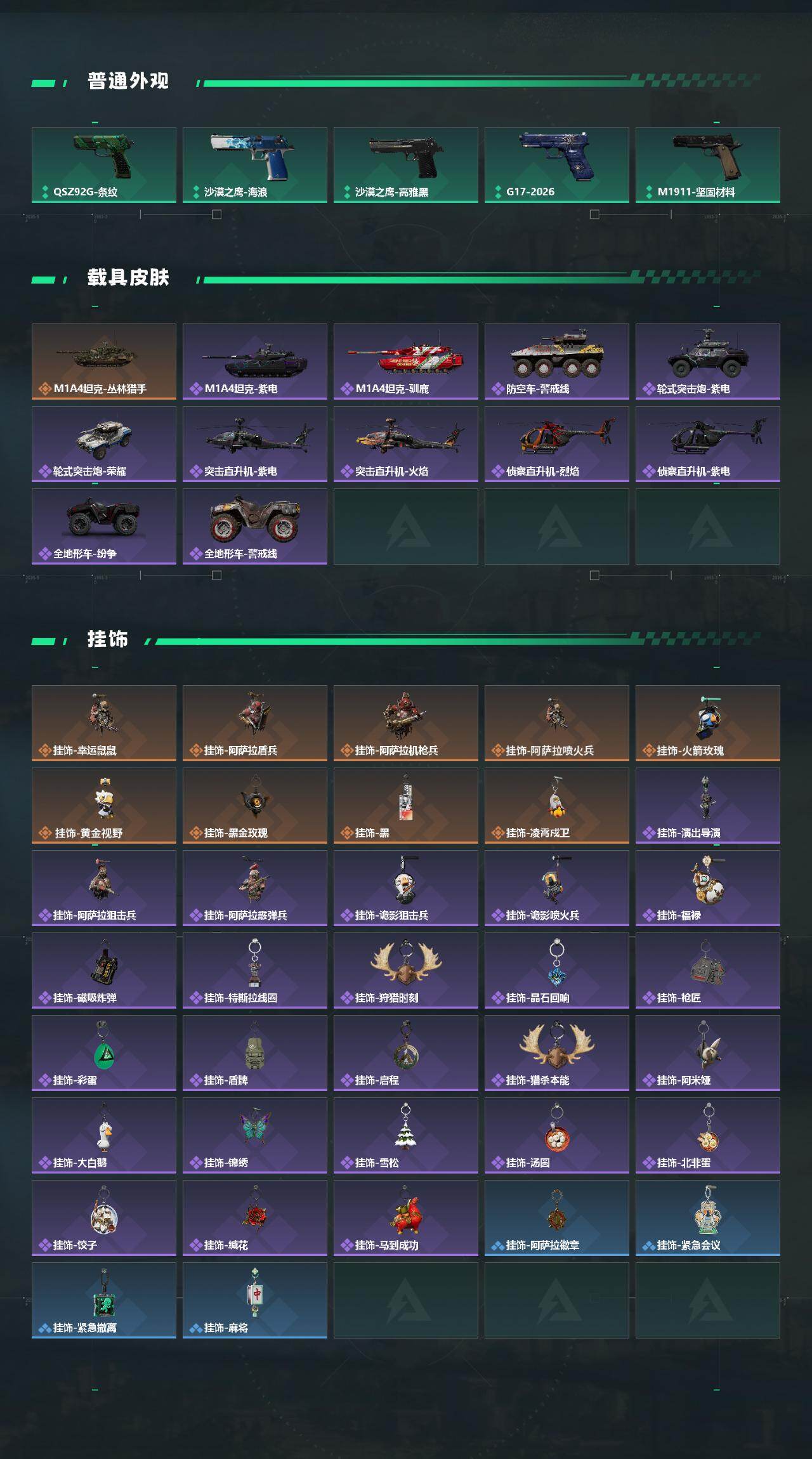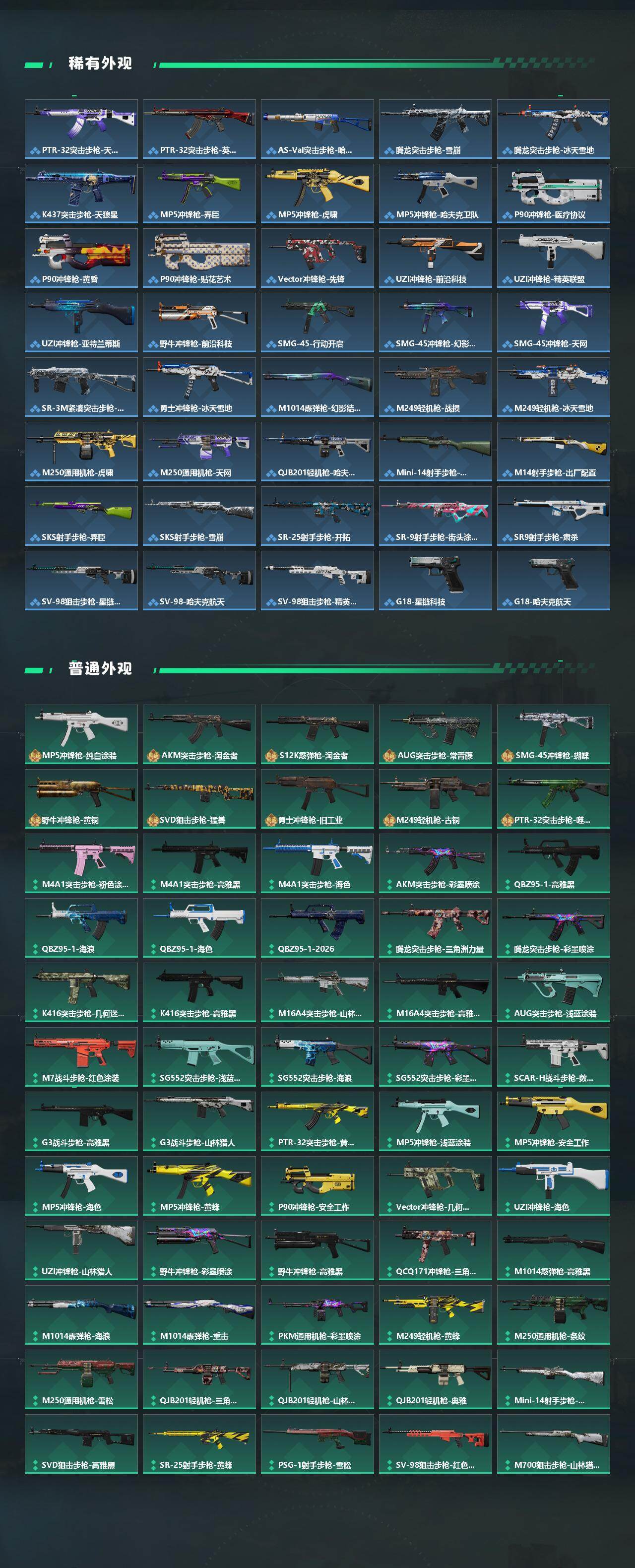 【史诗外观】:PTR-32突击步枪-碎冰行动,AKM突击步枪-林中猎手,QBZ95-1突击步枪-曙光,K416突击步枪-冬日风情,K416突击步枪-阿萨拉特攻,K416突击步枪-缄默情歌,AUG突击步枪-蝮蛇,SG552突击步枪-深海恐惧,SG552突击步枪-哈夫克警备,SCAR-H战斗步枪-囚徒,G3战斗步枪-哈夫克警备,AS Val突击步枪-典狱官,腾龙突击步枪-无垢,腾龙突击步枪-猎鳄行动,KC17突击步枪-缄默情歌,MP5冲锋枪-深海恐惧,MP5冲锋枪-战术竞备,MP5冲锋枪-竞技风,Vector冲锋枪-阿萨拉文明,SMG-45冲锋枪-阿萨拉特攻,SR-3M紧凑突击步枪-荒野求生,SR-3M紧凑突击步枪-战术竞备,勇士冲锋枪-深海恐惧,勇士冲锋枪-工业狂潮,MP7冲锋枪-无垢,MP7冲锋枪-六套之力,M1014霰弹枪-林中猎手,S12K霰弹枪-曙光,S12K霰弹枪-缄默情歌,PKM通用机枪-蝮蛇,PKM通用机枪-荒野求生,PKM通用机枪-阿萨拉特攻,M250通用机枪-囚徒,QJB201轻机枪-炽焰,SVD狙击步枪-阿萨拉工艺,SVD狙击步枪-荒野求生,M14射手步枪-工业狂潮,PSG-1射手步枪-无垢,