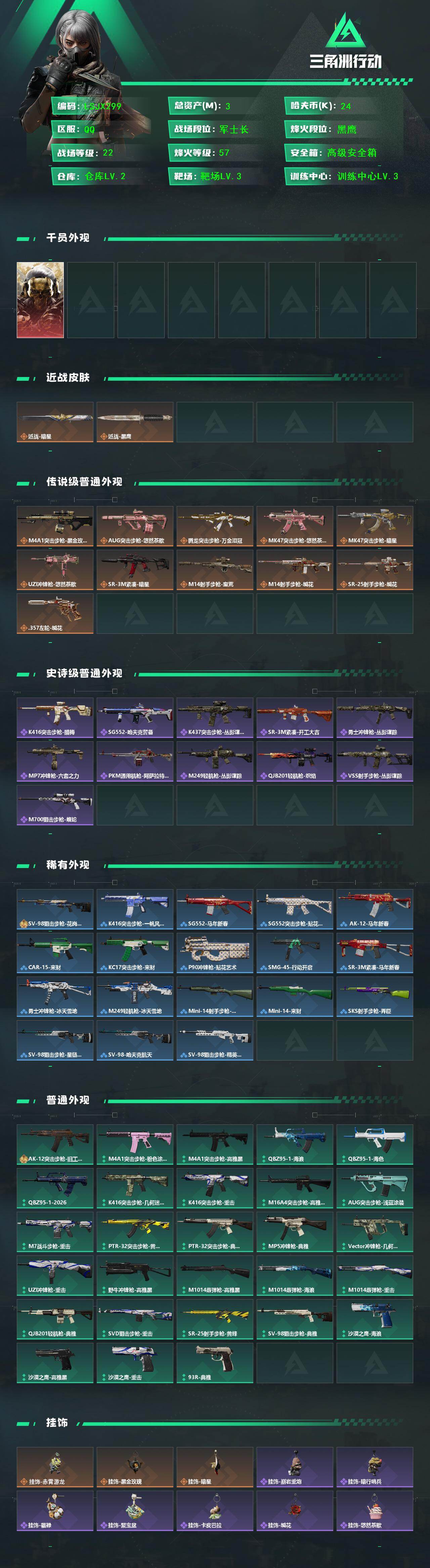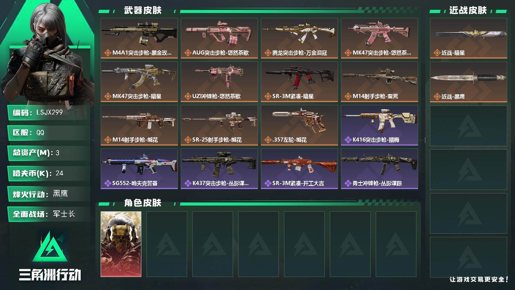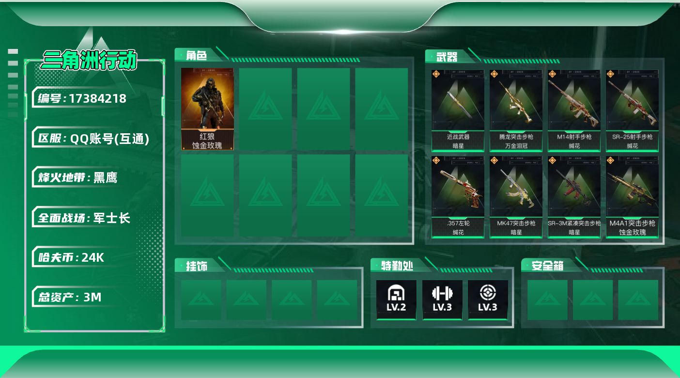 [17384218]【特价出售/店主推荐】3m总资产-24k哈伏币-57烽火等级-黑鹰-22战场等级-军士长 【干员外观】:红狼-蚀金玫瑰 【近战皮肤】:近战-暗星,近战-黑鹰 【传说外观】:M4A1突击步枪-蚀金玫瑰,AUG突击步枪-悠然茶歇,腾龙突击步枪-万金泪冠,MK47突击步枪-悠然茶歇,MK47突击步枪-暗星,UZI冲锋枪-悠然茶歇,SR-3M紧凑突击步枪-暗星,M14射手步枪-蛮荒,M14射手步枪-缄花,SR-25射手步枪-缄花,.357左轮-缄花 【史诗外观】:K416突击步枪-腊梅,SG552突击步枪-哈夫克警备,K437突击步枪-丛影谍踪,SR-3M紧凑突击步枪-开工大吉,勇士冲锋枪-丛影谍踪,MP7冲锋枪-六套之力,PKM通用机枪-阿萨拉特攻,M249轻机枪-丛影谍踪,QJB201轻机枪-炽焰,VSS射手步枪-丛影谍踪,M700狙击步枪-蝮蛇 【稀有外观】:SV-98狙击步枪-花岗岩,K416突击步枪-一帆风顺,SG552突击步枪-马年新春,SG552突击步枪-贴花艺术, AK-12突击步枪-马年新春,CAR-15突击步枪-来财,KC17突击步枪-来财,P90冲锋枪-贴花艺术,SMG-45冲锋枪-行动开启,SR-3M紧凑突击步枪-马年新春,勇士冲锋枪-冰天雪地,M249轻机枪-冰天雪地,Mini-14射手步枪-荣耀列队,Mini-14射手步枪-来财,SKS射手步枪-弄臣,SV-98狙击步枪-星链科技,SV-98狙击步枪-哈夫克航天,SV-98狙击步枪-精英联盟 【普通外观】:AK-12突击步枪-旧工业,M4A1突击步枪-粉色涂装,M4A1突击步枪-高雅黑,QBZ95-1突击步枪-海浪,QBZ95-1突击步枪-海色,QBZ95-1突击步枪-2026,K416突击步枪-几何迷彩,K416突击步枪-重击,M16A4突击步枪-高雅黑,AUG突击步枪-浅蓝涂装,M7战斗步枪-重击,PTR-32突击步枪-黄蜂,PTR-32突击步枪-典雅,MP5冲锋枪-典雅,Vector冲锋枪-几何迷彩,UZI冲锋枪-重击,野牛冲锋枪-高雅黑,M1014霰弹枪-高雅黑,M1014霰弹枪-海浪,M1014霰弹枪-重击,QJB201轻机枪-典雅,SVD狙击步枪-重击,SR-25射手步枪-黄蜂,SV-98狙击步枪-典雅,沙漠之鹰-海浪,沙漠之鹰-高雅黑,沙漠之鹰-重击,93R-典雅 【挂饰】:挂饰-