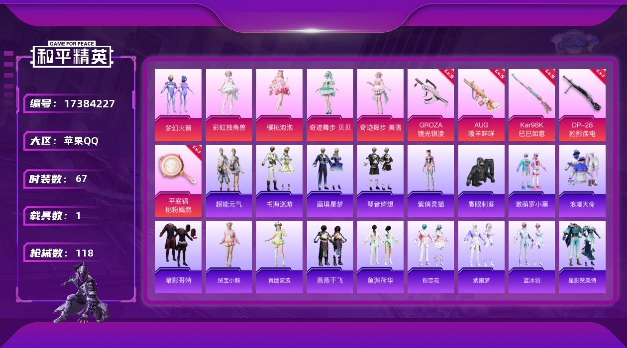 [17384227]苹果 手Q-1神装-6粉装-8特效枪-1载具-5粉色飞行器-36077热力值-5王牌印记-67套装-118枪皮