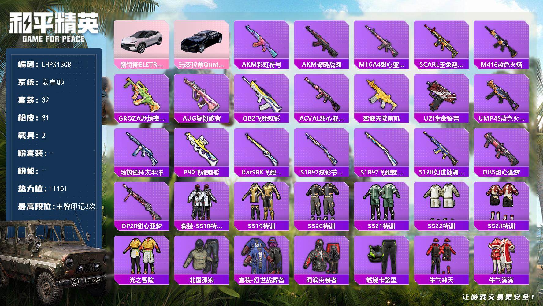 [17384265]安卓 手Q-0粉装-0特效枪-2载具-0粉色飞行器-11101热力值-3王牌印记-32套装-31枪皮 【粉色载具】:路特斯ELETRE(花绽灰),玛莎拉蒂Quattroporte(夜幕蓝) 【稀有枪皮】:AKM-彩虹符号,AKM-破晓战魂,M16A4-甜心亚梦,SCAR-L-玉兔迎春,M416-蓝色火焰,GROZA-恐龙拽拽,AUG-耀粉歌者,QBZ-飞驰魅影,AC-VAL-甜心亚梦,蜜獾-天降萌叽,UZI-生命誓言,UMP45-蓝色火焰,汤姆逊-环太平洋,P90-飞驰魅影,Kar98K-飞驰魅影,S1897-炫彩节奏,S1897-飞驰魅影,S12K-幻世战舞者,DBS-甜心亚梦,DP-28-甜心亚梦 【其他套装】:套装-SS18特训,套装-SS19特训,套装-SS20特训,套装-SS21特训,套装-SS22特训,套装-SS23特训,套装-光之冒险,套装-北国孤狼,套装-幻世战舞者,套装-海滨突袭者,套装-燃烧卡路里,套装-牛气冲天,套装-牛气满满,套装-玉兔迎春,套装-王牌教练,套装-空投萌叽,套装-竞技名士,套装-竞技达人朋克,套装-都市漫游者,套装-都市魅力,套装-酷萌兔限定,套装-长空猛禽,套装-青年教官,套装-飞行日记,套装-黑色伏地魔,套装-战地菁英,套装-飞驰魅影,套装-音速流光,套装-浓情蜜辣,套装-甜心亚梦,套装-虚音幻奏 【营地ID】:794228378