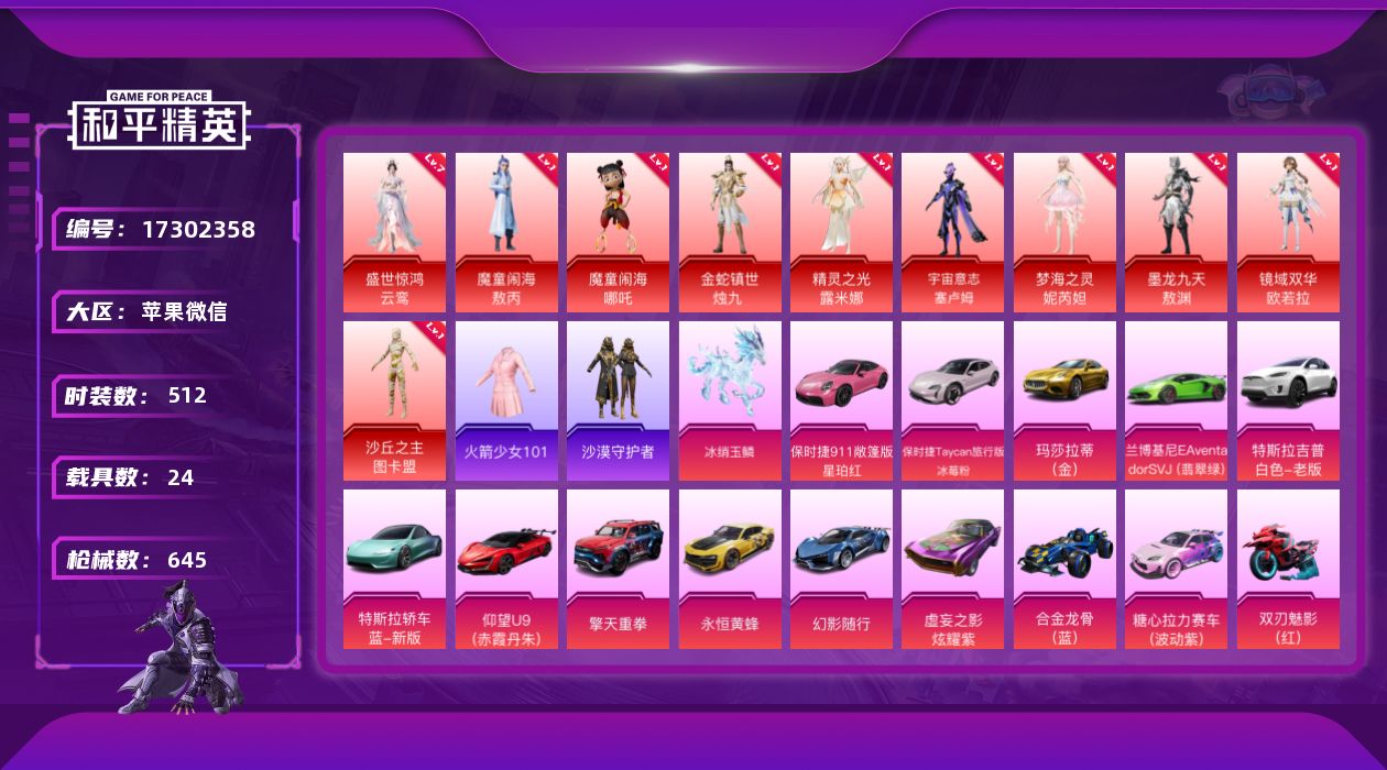 [17302358]【特价出售/店主推荐】满级红,老1 苹果 微信-10神装-131粉装-53特效枪-24载具-45粉色飞行器-354558热力值-31王牌印记-512套装-645枪皮 【红色神装等级】:魔童闹海-敖丙(一级),魔童闹海-哪吒(一级),金蛇镇世-烛九(一级),盛世惊鸿-云鸾(七级),精灵之光-露米娜(一级),宇宙意志-塞卢姆(一级),梦海之灵-妮芮妲(一级),墨龙九天-敖渊(一级),镜域双华-欧若拉(一级),沙丘之主-图卡盟(一级) 【红色角色神装】:魔童闹海-敖丙,魔童闹海-哪吒,金蛇镇世-烛九,盛世惊鸿-云鸾,精灵之光-露米娜,宇宙意志-塞卢姆,梦海之灵-妮芮妲,墨龙九天-敖渊,镜域双华-欧若拉,沙丘之主-图卡盟 【热门品类】:粉装-雪国幻梦,粉装-梦幻火箭,粉装-童趣迷兔,粉装-繁龙极客,套装-火箭少女101,套装-小丑鱼,角色-军刀雅典娜,套装-沙漠守护者,角色-2B战斗服款,角色-2P战斗服款,角色-忠猛周仓,角色-忠真马岱,套装-龟仙人,套装-潮萌小黄鸭,套装-暗影哥特,套装-浪漫波比,套装-粉红小猪,套装-红红火火,大砍刀-青龙偃月刀,撬棍-龙胆亮银枪 【粉色套装】:粉装-深海曼妙,粉装-深渊皇后,粉装-宝贝奶油派,粉装-天使彩虹糖,粉装-雪国幻梦,粉装-蝶舞迷情,粉装-精灵迷巫,粉装-梦幻火箭,粉装-天启纪元,粉装-星之信仰,粉装-智能音符,粉装-狩月元帅,粉装-琉璃脉冲,粉装-新星烈龙,粉装-向日葵,粉装-甜蜜誓约,粉装-心之恋语,粉装-极致幻想,粉装-扶摇飞仙,粉装-潮汐统领,粉装-诡面斩,粉装-锦绣火鲤,粉装-迷蝶贵族,粉装-苍蓝魅影,粉装-翡翠骑士,粉装-绚金战神,粉装-童趣迷兔,粉装-炙焰红王,粉装-香水柠檬,粉装-星之彼岸,粉装-相思残雪,粉装-馨动时刻,粉装-烈焰拳霸,粉装-蝶舞蔷薇,粉装-葫芦兄弟,粉装-铁血龙王,粉装-桀骜红莲,粉装-焰龙焚天,粉装-银龙傲海,粉装-暗夜玫瑰,粉装-林间仙鹿,粉装-彩虹鹿灵,粉装-山涧鹿灵,角色-洛天依,粉装-沙场疾风,粉装-俏雪含霜,粉装-吟月归客,粉装-海渊国主,角色-2号机款机体服,粉装-橘柚倾心,粉装-冷魅冰骑,粉装-赤焰黑爵,粉装-紫电风暴,粉装-圣光天使,粉装-闪光银龙,角色-复仇流浪者,粉装-傲雪凌霜,粉装-霁雪冰心,粉装-垂柳戏鸭,粉装-灵感创作师,粉装-太空嘟嘟,粉装-千面幻镜,粉装-