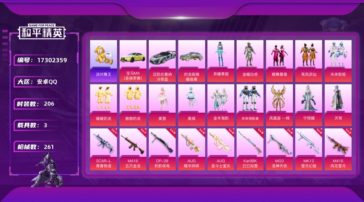 [17302359]【特价出售/店主推荐】安卓 手Q-14粉装-10特效枪-3载具-2粉色飞行器-85263热力值-21王牌印记-206套装-261枪皮 【热门品类】:绝对防御上衣,套装-派对舞王,套装-金羽特工,套装-龟仙人,套装-粉红小猪,角色-Mark.06 【粉色套装】:粉装-金曜白虎,粉装-蝶舞蔷薇,粉装-鸾凤武仙,粉装-未来歌姬,粉装-暖暖奶龙,粉装-傲傲奶龙,角色-美雪,角色-美琪,粉装-金丰海韵,粉装-未来领航者,角色-凤凰座 一辉,角色-宁雨蝶,角色-天穹,角色-异瞳寒姬 【粉色枪皮等级】:SCAR-L-青春物语(七级),M416-五爪金龙(七级),M416-风花雪月(三级),AUG-暖羊咩咩(五级),AUG-圣斗士星矢(五级),Kar98K-巳巳如意(五级),莫辛纳甘-未来领航者(二级),MK12-雪月幻音(四级),DP-28-豹影疾电(五级),MG3-洛神天依(五级) 【粉色载具】:宝马M4(圣保罗黄),迈凯伦塞纳(冷萃蓝),炽龙极锋(暗夜黑) 【粉色枪皮】:SCAR-L-青春物语,M416-五爪金龙,M416-风花雪月,AUG-暖羊咩咩,AUG-圣斗士星矢,Kar98K-巳巳如意,莫辛纳甘-未来领航者,MK12-雪月幻音,DP-28-豹影疾电,MG3-洛神天依 【粉色飞行器】:幻海精灵飞行器,宁雨蝶飞行器 【粉色降落伞】:古战神甲降落伞,暗夜玫瑰降落伞,暗夜鎏金降落伞,黄族统领降落伞,白勺歌姬降落伞,镜域双华降落伞,创世·救赎降落伞,临安公主降落伞,赛博古神降落伞,雪月幻音降落伞,圣域龙灵降落伞,宁雨蝶降落伞,炫彩糖果降落伞 【稀有套装】:套装-龟仙人,套装-巳巳如意,套装-雏菊兔兔,套装-萝兰蝴蝶,套装-小熊娃娃,套装-糖糖葫芦,套装-青团波波,角色-许七安,套装-燕燕于飞,套装-鱼渊荷华,套装-粉恋花,套装-紫幽梦,套装-蓝冰羽,套装-云朵鹅,套装-雪绒豹,角色-时希公主,角色-灵公主 【稀有枪皮】:AKM-彩虹符号,AKM-恐龙拽拽,AKM-灼热熔岩,AKM-生命誓言,AKM-破晓战魂,AKM-萌趣颜团子,AKM-虎虎生威,AKM-霓虹街区,AKM-龙的传人,M16A4-幻世战舞者,M16A4-蓝色火焰,SCAR-L-夜灯,SCAR-L-玉兔迎春,SCAR-L-红色方程式,SCAR-L-黄金龙骨,SCAR-L-冷漠罗丽,M416-夜灯,M416-糯团青竹