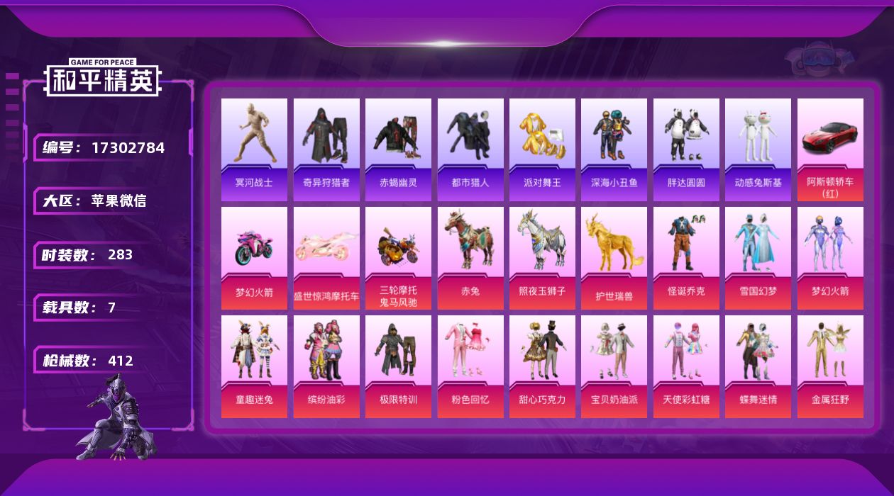 [17302784]【特价出售/店主推荐】苹果 微信-无敌战神框-33粉装-31特效枪-7载具-5粉色飞行器-156348热力值-21王牌印记-283套装-412枪皮 【热门品类】:粉装-怪诞乔克,粉装-雪国幻梦,粉装-梦幻火箭,粉装-童趣迷兔,粉装-缤纷油彩,套装-浪漫天命,套装-赤蝎幽灵,套装-都市猎人,套装-冥河战士,套装-派对舞王,套装-深海小丑鱼,套装-小丑鱼,套装-奇异狩猎者,套装-胖达圆圆,套装-动感兔斯基人偶服,套装-AG战队服,角色-忠真马岱,套装-潮萌小黄鸭,套装-暗影哥特,套装-浪漫波比,套装-萌熊伴侣,角色-六号稻草人,M416-星际漫游,大砍刀-青龙偃月刀,撬棍-龙胆亮银枪,套装-红熊茄茄 【粉色套装】:粉装-极限特训,粉装-粉色回忆,粉装-怪诞乔克,粉装-甜心巧克力,粉装-宝贝奶油派,粉装-天使彩虹糖,粉装-雪国幻梦,粉装-蝶舞迷情,粉装-梦幻火箭,粉装-金属狂野,粉装-缤纷油彩,粉装-放客神游,粉装-花间之火,粉装-俏皮狐尾,粉装-冰霜白皇,粉装-童趣迷兔,粉装-炙焰红王,粉装-香水柠檬,粉装-馨动时刻,粉装-暗夜玫瑰,角色-闪耀迪迦,粉装-彩虹鹿灵,角色-洛天依,粉装-岚岚物语,粉装-橘柚倾心,粉装-灵感创作师,粉装-炫光之旅,粉装-暖暖奶龙,角色-月影灵韵,角色-樱桃泡泡,角色-冷漠罗丽,角色-荧海星豚,角色-绯穹魔姬 【粉色枪皮等级】:AKM-炫紫旋律(一级),AKM-百合蜜语(七级),AKM-魔法神域(三级),SCAR-L-童趣迷兔(一级),SCAR-L-金蛇镇世(六级),M416-心之恋语(一级),M416-暖熊萌萌(七级),GROZA-焦糖拿铁(四级),AUG-超新星(五级),M762-甜蜜誓约(六级),蜜獾-荧海星豚(一级),蜜獾-异瞳寒姬(五级),UZI-绮梦青鸾(五级),UMP45-相思残雪(四级),Vector-灵感创作师(六级),Vector-绯穹魔姬(一级),汤姆逊-热量炸弹(五级),P90-能量风暴(五级),P90-冷漠罗丽(一级),Kar98K-绿意幻情(三级),Kar98K-巳巳如意(五级),Kar98K-圣域龙灵(三级),AWM-橘柚倾心(四级),Mk14-樱桃泡泡(四级),Mk14-甜梦熊击(五级),AMR-智耀战神(四级),S12K-海渊国主(五级),DP-28-豹影疾电(五级),MG3-洛神天依(四级),平底锅-林间