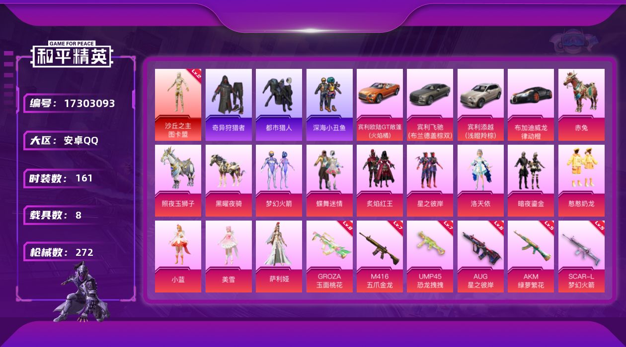 [17303093]【特价出售/店主推荐】安卓 手Q-2神装-10粉装-20特效枪-8载具-16粉色飞行器-99270热力值-15王牌印记-161套装-272枪皮