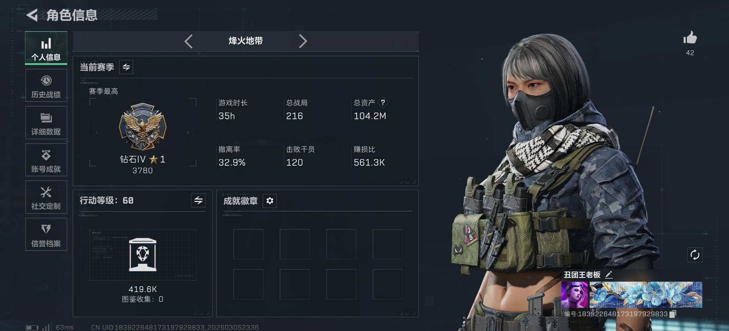 [17385946]104m总资产-31024k哈伏币-60烽火等级-钻石-22战场等级-上等兵