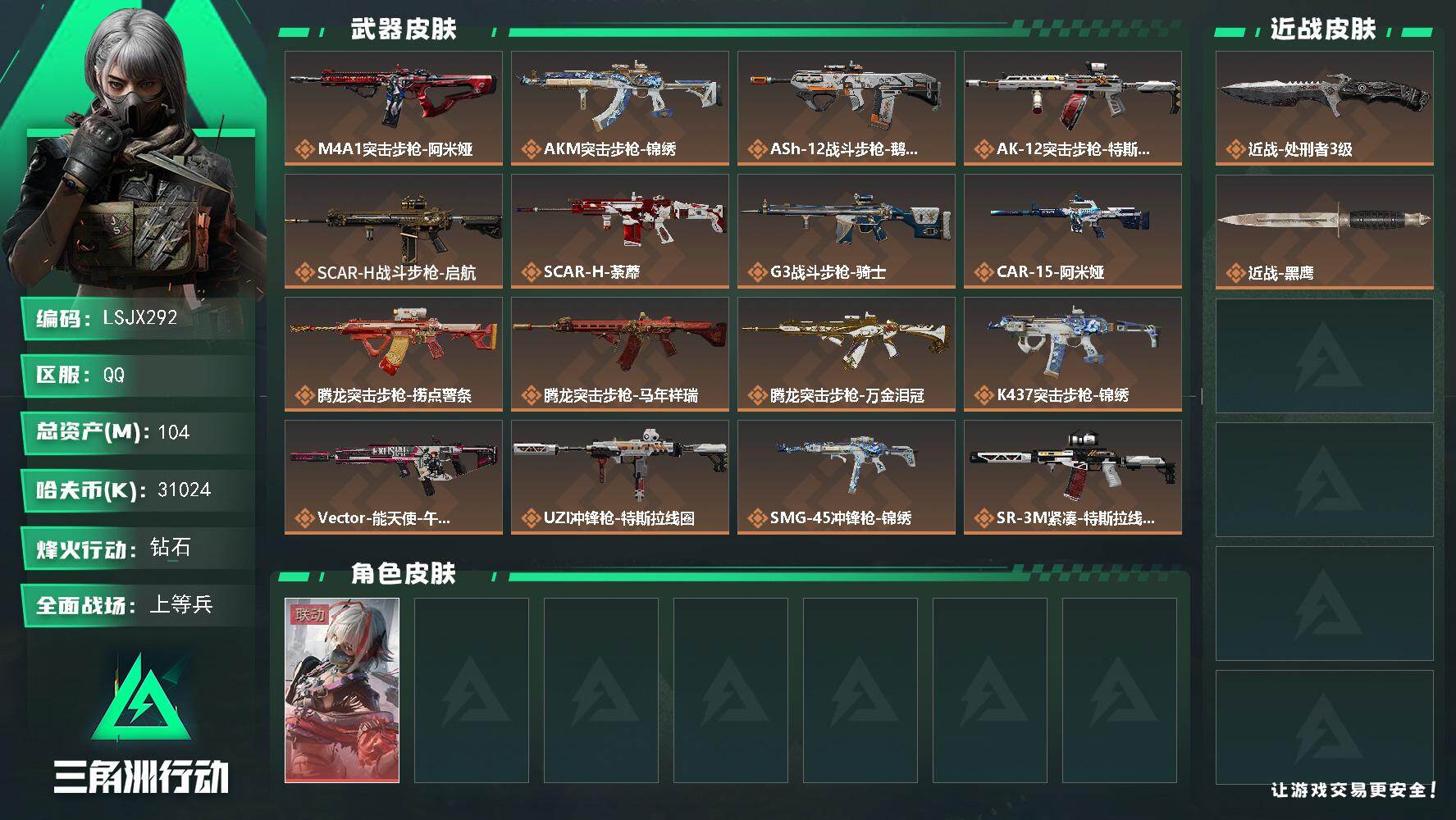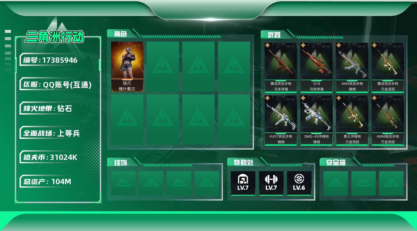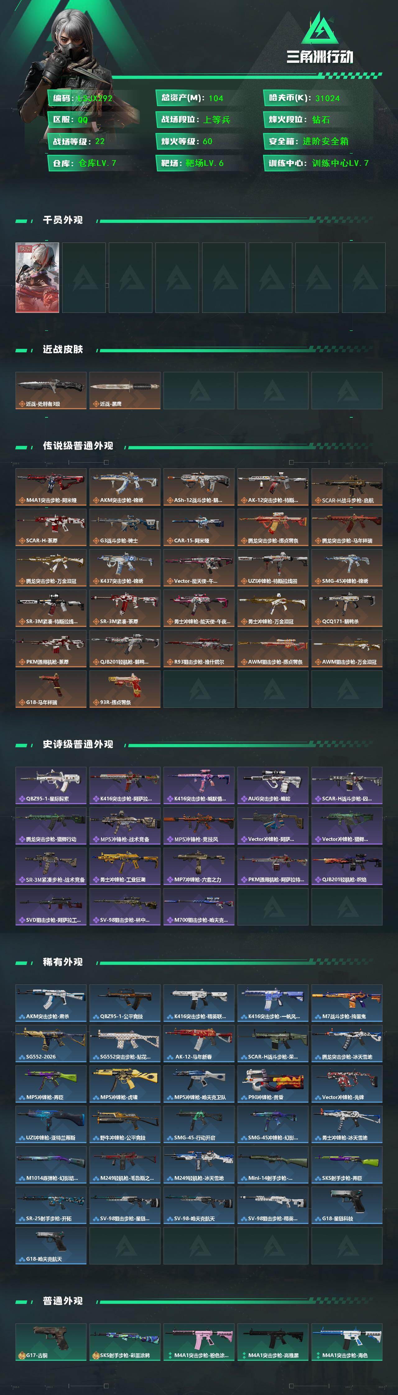 [17385946]104m总资产-31024k哈伏币-60烽火等级-钻石-22战场等级-上等兵 【干员外观】:骇爪-维什戴尔 【近战皮肤】:近战-处刑者3级,近战-黑鹰 【传说外观】:M4A1突击步枪-阿米娅,AKM突击步枪-锦绣,ASh-12战斗步枪-鹅鸭杀,AK-12突击步枪-特斯拉线圈,SCAR-H战斗步枪-启航,SCAR-H战斗步枪-荼蘼,G3战斗步枪-骑士,CAR-15突击步枪-阿米娅,腾龙突击步枪-捞点薯条,腾龙突击步枪-马年祥瑞,腾龙突击步枪-万金泪冠,K437突击步枪-锦绣,Vector冲锋枪-能天使-午夜邮差,UZI冲锋枪-特斯拉线圈,SMG-45冲锋枪-锦绣,SR-3M紧凑突击步枪-特斯拉线圈,SR-3M紧凑突击步枪-荼蘼,勇士冲锋枪-能天使-午夜邮差,勇士冲锋枪-万金泪冠,QCQ171冲锋枪-鹅鸭杀,PKM通用机枪-荼蘼,QJB201轻机枪-鹅鸭杀,R93狙击步枪-维什戴尔,AWM狙击步枪-捞点薯条,AWM狙击步枪-万金泪冠,G18-马年祥瑞,93R-捞点薯条 【史诗外观】:QBZ95-1突击步枪-星际探索,K416突击步枪-阿萨拉特攻,K416突击步枪-缄默情歌,AUG突击步枪-蝮蛇,SCAR-H战斗步枪-囚徒,腾龙突击步枪-猎鳄行动,MP5冲锋枪-战术竞备,MP5冲锋枪-竞技风,Vector冲锋枪-阿萨拉文明,Vector冲锋枪-猎鳄行动,SR-3M紧凑突击步枪-战术竞备,勇士冲锋枪-工业狂潮,MP7冲锋枪-六套之力,PKM通用机枪-阿萨拉特攻,QJB201轻机枪-炽焰,SVD狙击步枪-阿萨拉工艺,SV-98狙击步枪-林中猎手,M700狙击步枪-哈夫克警备 【稀有外观】:AKM突击步枪-肃杀,QBZ95-1突击步枪-公平竞技,K416突击步枪-精英联盟,K416突击步枪-一帆风顺,M7战斗步枪-捣蛋鬼,SG552突击步枪-2026,SG552突击步枪-贴花艺术, AK-12突击步枪-马年新春,SCAR-H战斗步枪-荣耀列队,腾龙突击步枪-冰天雪地,MP5冲锋枪-弄臣,MP5冲锋枪-虎啸,MP5冲锋枪-哈夫克卫队,P90冲锋枪-黄昏,Vector冲锋枪-先锋,UZI冲锋枪-亚特兰蒂斯,野牛冲锋枪-公平竞技,SMG-45冲锋枪-行动开启,SMG-45冲锋枪-幻影结构,勇士冲锋枪-冰天雪地,M1014霰弹枪-幻影结构,M249轻机枪-毛鲁斯之力,M249轻机枪-