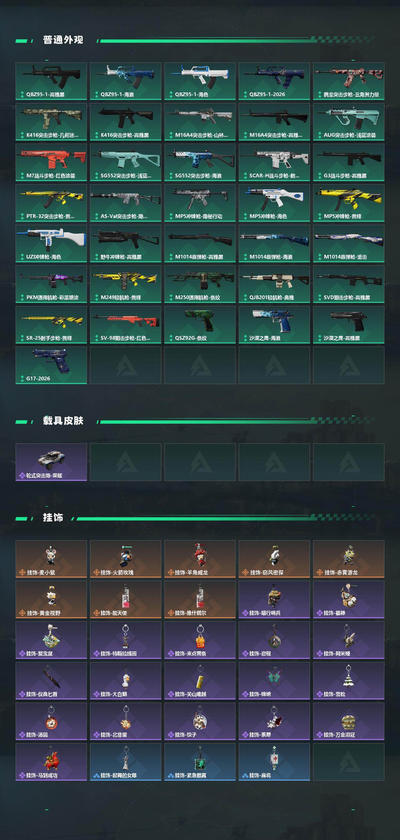 【稀有外观】:AKM突击步枪-肃杀,QBZ95-1突击步枪-公平竞技,K416突击步枪-精英联盟,K416突击步枪-一帆风顺,M7战斗步枪-捣蛋鬼,SG552突击步枪-2026,SG552突击步枪-贴花艺术, AK-12突击步枪-马年新春,SCAR-H战斗步枪-荣耀列队,腾龙突击步枪-冰天雪地,MP5冲锋枪-弄臣,MP5冲锋枪-虎啸,MP5冲锋枪-哈夫克卫队,P90冲锋枪-黄昏,Vector冲锋枪-先锋,UZI冲锋枪-亚特兰蒂斯,野牛冲锋枪-公平竞技,SMG-45冲锋枪-行动开启,SMG-45冲锋枪-幻影结构,勇士冲锋枪-冰天雪地,M1014霰弹枪-幻影结构,M249轻机枪-毛鲁斯之力,M249轻机枪-
