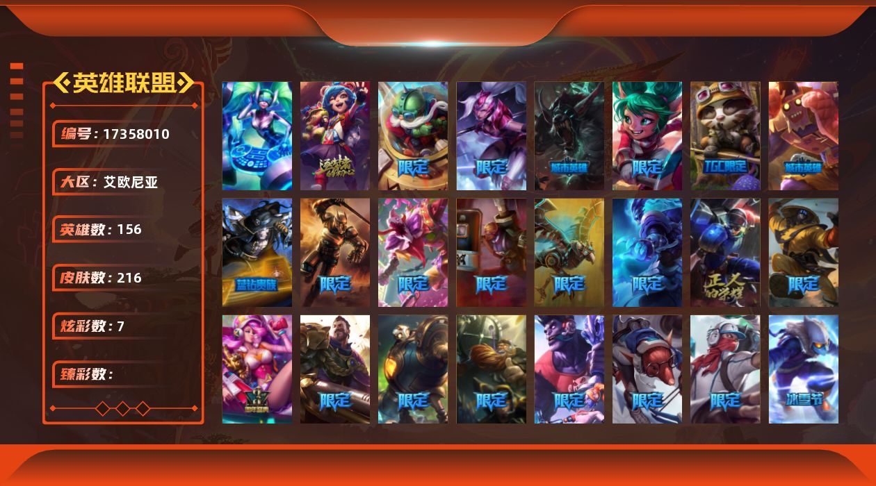 [17358010]未定级段位-156英雄-216皮肤-7炫彩-1终极-1神话-38限定-22传说-71史诗