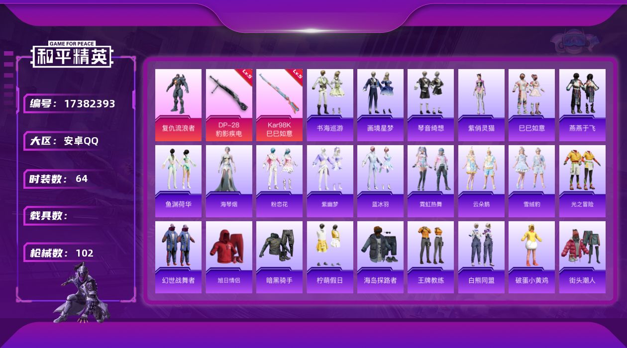 [17382393]【店主推荐捡漏号】安卓 手Q-1粉装-4特效枪-0载具-1粉色飞行器-25981热力值-2王牌印记-64套装-102枪皮【粉色套装】:角色-复仇流浪者【粉色枪皮等级】:UMP45-萌骑冒险(四级),Kar98K-巳巳如意(五级),Mk14-福马献瑞(五级),DP-28-豹影疾电(五级)【粉色枪皮】:UMP45-萌骑冒险,Kar98K-巳巳如意,Mk14-福马献瑞,DP-28-豹影疾电