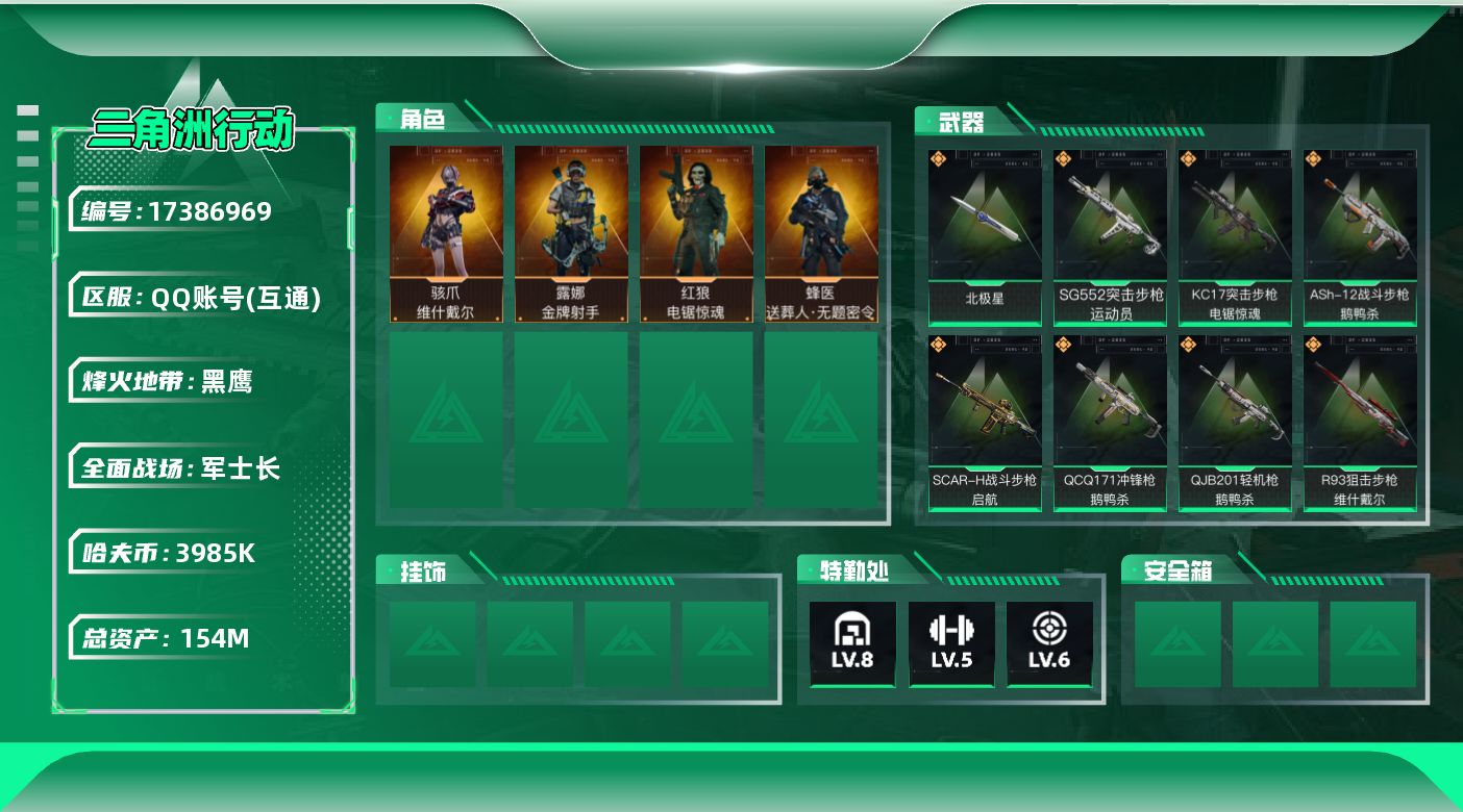 [17386969]【店主推荐捡漏号!可直接换绑】154m总资产-3985k哈伏币-60烽火等级-黑鹰-21战场等级-军士长 【干员外观】:骇爪-维什戴尔,蜂医-送葬人·无题密令,红狼-电锯惊魂,露娜-金牌射手 【近战皮肤】:近战-北极星,近战-黑鹰 【传说外观】:M4A1突击步枪-阿米娅,ASh-12战斗步枪-鹅鸭杀,SG552突击步枪-运动员,AK-12突击步枪-特斯拉线圈,SCAR-H战斗步枪-启航,CAR-15突击步枪-阿米娅,K437突击步枪-北极星,KC17突击步枪-电锯惊魂,Vector冲锋枪-能天使-午夜邮差,UZI冲锋枪-特斯拉线圈,SR-3M紧凑突击步枪-特斯拉线圈,勇士冲锋枪-能天使-午夜邮差,QCQ171冲锋枪-北极星,QCQ171冲锋枪-鹅鸭杀,725双管霰弹枪-送葬人-无题密令,M250通用机枪-骑士之心,QJB201轻机枪-鹅鸭杀,R93狙击步枪-维什戴尔 【史诗外观】:QBZ95-1突击步枪-曙光,ASh-12战斗步枪-无极限,AUG突击步枪-蝮蛇,M7战斗步枪-百步穿杨,SCAR-H战斗步枪-囚徒,G3战斗步枪-流沙送葬,AS Val突击步枪-百步穿杨,腾龙突击步枪-无垢,K437突击步枪-守护者,MP5冲锋枪-战术竞备,MP5冲锋枪-竞技风,Vector冲锋枪-百步穿杨,SR-3M紧凑突击步枪-荒野求生,SR-3M紧凑突击步枪-战术竞备,勇士冲锋枪-工业狂潮,MP7冲锋枪-无垢,MP7冲锋枪-守护者,PKM通用机枪-蝮蛇,PKM通用机枪-荒野求生,M250通用机枪-囚徒,Mini-14射手步枪-守护者,SVD狙击步枪-荒野求生,SR-25射手步枪-聚光灯,PSG-1射手步枪-无垢,SV-98狙击步枪-林中猎手,SV-98狙击步枪-囚徒,M700狙击步枪-蝮蛇,M700狙击步枪-百步穿杨,M700狙击步枪-哈夫克警备,AWM狙击步枪-无极限,AWM狙击步枪-流沙送葬,沙漠之鹰-曙光,复合弓-守护者 【稀有外观】:M7战斗步枪-天际线,PSG-1射手步枪-极地勘察队,M4A1突击步枪-繁盛,AKM突击步枪-战术演练,AKM突击步枪-肃杀,QBZ95-1突击步枪-公平竞技,ASh-12战斗步枪-繁盛,K416突击步枪-虎啸,M7战斗步枪-精英联盟,M7战斗步枪-捣蛋鬼,SCAR-H战斗步枪-荣耀列队,SCAR-H战斗步枪-黄昏,G3战斗步枪-战术演练,