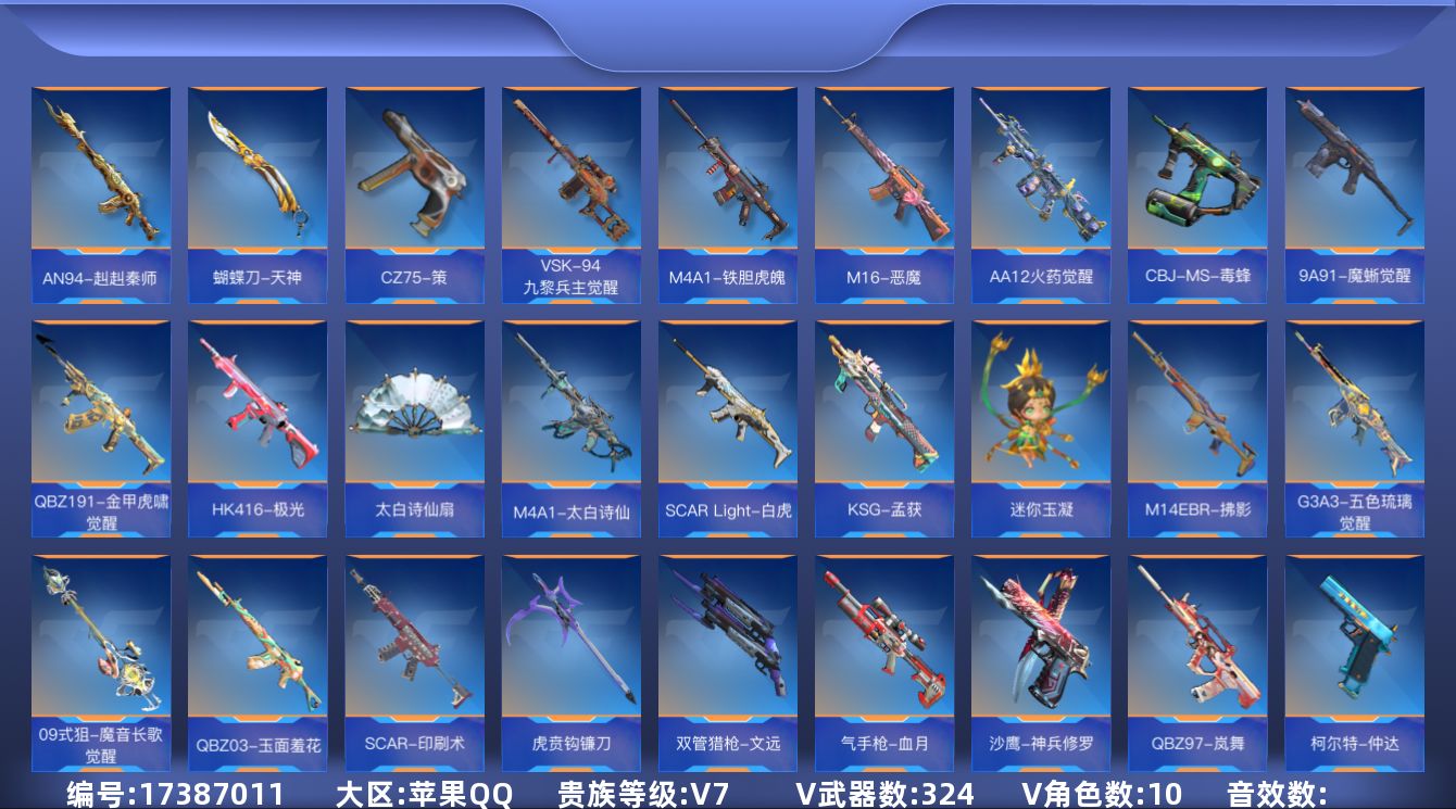 [17387011]10英雄角色数-314英雄武器数 【王者系列】:王者之影,王者之心,王者之迹,王者之蝶,王者之兽,王者之狱,王者之魂,王者之霆,王者之业,王者之誉 【热门武器】:KSG-孟获,81式-光明之神,M4A1-仲达,AK47-常胜,M4A1-星象,AK47-游骑兵,M4A1-游骑兵,TAC-慈,M200-幻神,AWM-游骑兵,VEPR12-宙斯,COP 357-赤龙,黄金COP 357,COP 357-A,COP 357-绚樱*4,CZS2-仲康,AN94-盖 【角色】:幽灵刀锋-觉醒,樱,瞳,关小雨,职场灵狐-赛事经理,零-水下丽影,炽天使-X,零-新生,步练师,罗峰&巴巴塔-X 【英雄武器】:AK47-无影,AK47-火麒麟,AK47-麒麟,AK47-角斗士,AK47-耀金伯爵,AK47-游骑兵,AK47-常胜,AK47-樱斗士-二觉,AK47-竞技战魂,AK47-猩红传说,AK47-燎天净火,AK47-雷麒麟,AK47-心动次元,AK47-血武士,AK47-华夏传说,AK47-黑鲨,AK47-木兰,AK47-谜城烟火*2,M4A1-雷神*2,M4A1-黑骑士,M4A1-黑龙,M4A1-死神*2,M4A1-玫瑰精灵,M4A1-天使,M4A1-游骑兵,M4A1-枪娘,M4A1-星象,M4A1-雷神-萝拉,M4A1-龙血,M4A1-仲达,M4A1-机械迷城,M4A1-破空冰刃,M4A1-心动次元,M4A1-运输船*2,M4A1-猎神,M4A1-夏清,M4A1-太白诗仙*2,M4A1-铁胆虎魄,SCAR-幽暗骑士,SCAR Light-白虎,SCAR-探星者,SCAR-印刷术,SCAR-心动PICK,剑齿虎-炫彩,AN94-四凶觉醒,AN94-赳赳秦师,AN94-盖,AUG-机械纪元,9A91-天神,9A91-魔蜥觉醒,M14EBR-天神,M14EBR-拂影,M14EBR-葫芦山庄*2,M16-恶魔,AK12-天启,QBZ03-湮灭*2,QBZ03-金色蔷薇,QBZ03-死神*2,QBZ03-玉面羞花,HK416-极光,HK417-炎龙铠甲,81式-光明之神,MK47-云舞,G3A3-五色琉璃觉醒,G3A3-衍神兵*2,QBZ97-岚舞,QBZ97-浩瀚征途,QBZ191-金甲虎啸觉醒,QBZ191-封神榜,AWM-天龙,AWM-游骑兵,AWM-指南针,巴雷特-毁灭*2,