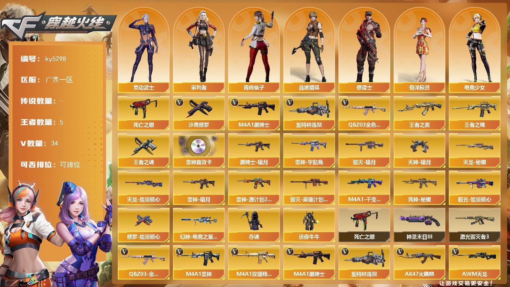 [17336417]【ky5298】广西一区-33V-5王者武器数-0炫金武器数 【热门武器】:QBZ03-金色蔷薇,死亡之眼,M4A1-黑骑士,加特林-炼狱,沙鹰-修罗*2 【王者炫金武器】:王者之翼,王者之魄,王者之魂 【音效卡】:M4A1-雷神音效卡 【皮肤】:幻神-电竞之星 皮肤,雷神-暗月,雷神-宇航兔皮肤,雷神-源计划2.0专属 皮肤,毁灭-暗月,毁灭-英雄计划 皮肤,M4A1-千变-孔明皮肤,黑骑士-暗月*2,死神-秘银*2,天龙-秘银,天龙-能量核心,极光-能量核心*2,修罗-能量核心,天神-暗月*4 【角色】:审判者,战地猎狐,奇洋探员,修道士,电竞少女,飞虎队-X,风暴女,灵动武士,麻雀,潘多拉-X,青霞仙子,影武者-X,游珑儿 【人偶武器】:夺魂,迷你牛牛 【暴走生化】:死亡之眼 【挑战大师】:激光毁灭者III,神圣爆裂者-末日III 【英雄级武器】:AK47-火麒麟,M4A1-雷神*2,M4A1-黑骑士,AK47-黑鲨,黑武士-锦绣游龙,超新星-热带奇洋,M4A1-玫瑰精灵,QBZ03-金色蔷薇,AWM-天龙,Barrett-毁灭,Barrett-极光,Barrett-朱雀,加特林-炼狱,沙鹰-修罗*2,沙鹰-天神*2,屠龙*3,龙啸,龙啸-热带奇洋,斩神刀-雷暴,高爆手雷-雷暴,手雷-热带奇洋,闪光弹-雷暴,烟雾弹-雷暴,烟雾弹-雷霆王者-觉醒版,M4A1-赤狱骑士 【道具】:CFS限定背包,奇洋探员-海龟背包,战舰背包,热带奇洋炫彩背包,虎牙炫彩背包,超级背包,女皇终结者-魔龙之吻,救世主-黑桃战神,绿色巨人,灵魂忍者,迷雾幽灵,生化弹匣,夺命之镰,防化服*2,星辰流光-枪王排位,巅峰赛先锋-金色流光,流光-再燃火线,枪王排位28赛季金色流光,枪王排位29赛季金色流光,热带奇洋表情,C4-再燃火线,防弹头盔*5,防弹衣*6,C4工具钳*4,手雷包*4 【特殊枪械】:1黑骑士,1炼狱