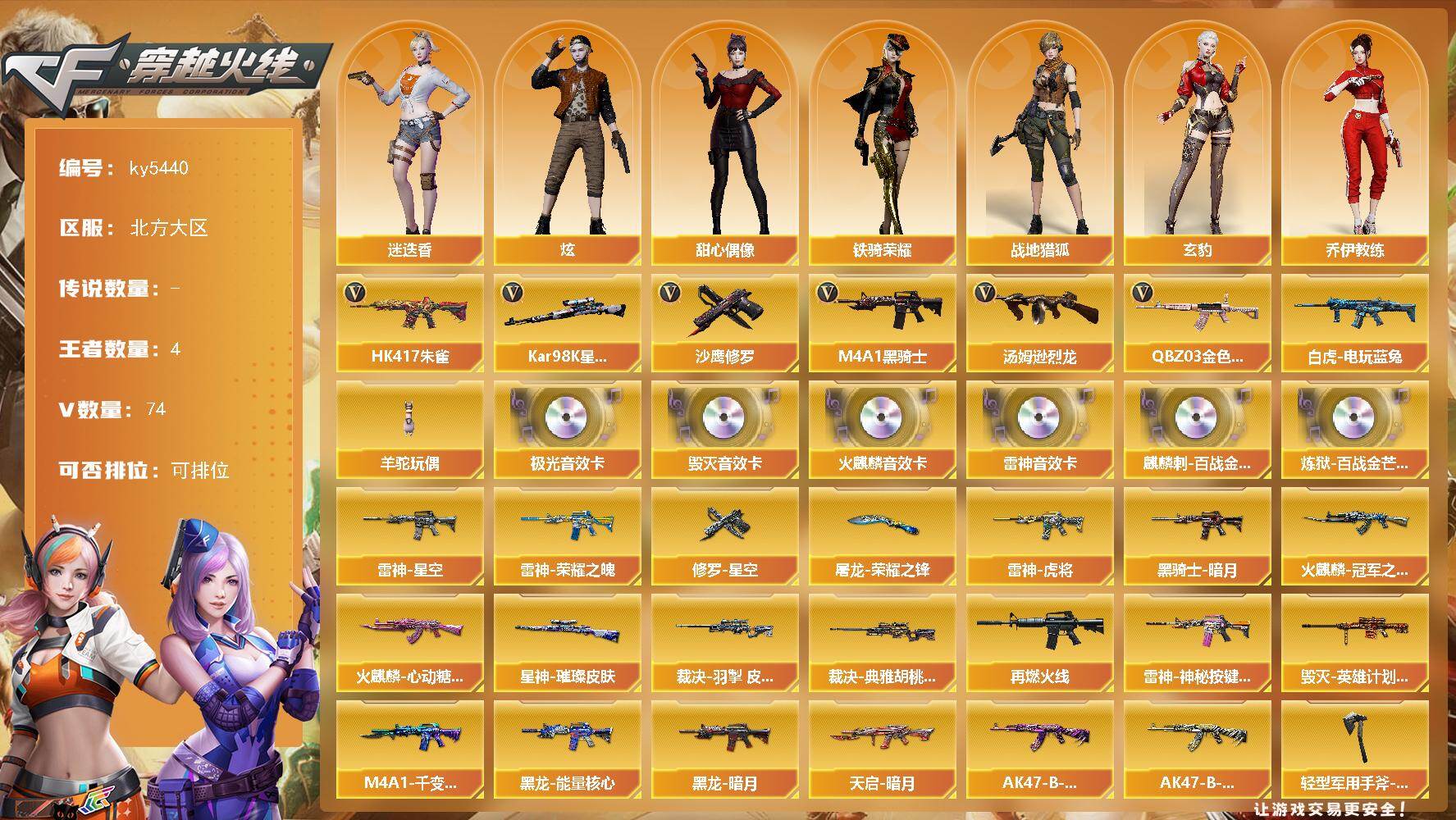 [17310279]【ky5440】北方大区-80V-4王者武器数-0炫金武器数 【热门武器】:QBZ03-金色蔷薇,HK417-朱雀,白虎-电玩蓝兔,Kar98K-星神,M4A1-黑骑士*2,汤姆逊-烈龙,羊驼玩偶,沙鹰-修罗*5 【音效卡】:AK47-火麒麟音效卡,M4A1-雷神音效卡,Barrett-毁灭音效卡,Barrett-极光音效卡,麒麟刺-百战金芒-盛典舞曲音效卡,炼狱-百战金芒-庆典舞曲音效卡 【皮肤】:裁决-羽掣 皮肤,裁决-典雅胡桃 皮肤,星神-璀璨皮肤,雷神-荣耀之魄,雷神-星空,雷神-虎将,M4A1-再燃火线,雷神-神秘按键 皮肤,火麒麟-冠军之心,火麒麟-心动糖果,毁灭-英雄计划 皮肤,M4A1-千变-孔明皮肤,黑龙-能量核心,黑龙-暗月*3,黑骑士-暗月,天启-暗月,AK47-B-常胜将军-曹操,AK47-B-常胜将军-刘备,修罗-星空,屠龙-荣耀之锋,轻型军用手斧-再燃火线 【角色】:炫,迷迭香,玄豹,战地猎狐,乔伊教练,暗夜-X,电竞少女,芳心审判者,风暴女,虎妞,嘉年华灵狐,0号玩家,灵狐者-X,龙儿,龙儿-小淘气,麻雀,曼陀罗-X,潘多拉-X,斯沃特-X,甜心偶像,铁骑荣耀,维纳斯,游珑儿,智影 【人偶武器】:王者Barrett-英勇金戈,异变清道夫-蛇影双骄,AWM-灵狐-15周年嘉年华,迷你深渊冰龙*2,迷你裂空之翼,迷你牛魔王,迷你波特博士,夺魂,迷你牛牛,迷你生化手雷,生化手雷-机甲核心,深渊终结者手雷*2,闪光弹-小乔,闪光弹-貂蝉,高爆手雷-大乔,迷你巨石泰坦-魔花研究所 【暴走生化】:超级对讲机 【挑战大师】:冰龙粉碎者-白马银枪,激光毁灭者III-白马银枪,神圣爆裂者-末日III*2 【英雄级武器】:AK47-火麒麟*3,M4A1-雷神,M4A1-黑骑士*2,AK12-天启,AK47-黑鲨,HK417-朱雀,无影-神兵利器,黑武士-锦绣游龙,SCAR Light-玄豹,QBZ03-金色蔷薇,烈火-动感闪耀,王者之心-觉醒版,黑骑士-海王,AK47-B-常胜将军,白虎-电玩蓝兔,Barrett-毁灭,Barrett-极光*2,AWM-裁决*3,Kar98K-星神,王者之光-觉醒版,炼狱-百战金芒,汤姆逊-烈龙,AA-12-雷霆,沙鹰-修罗*5,Anaconda-玄豹,天神-动感闪耀,屠龙*2,麒麟刺-堕天神,屠龙-动感闪耀,麒麟刺-百