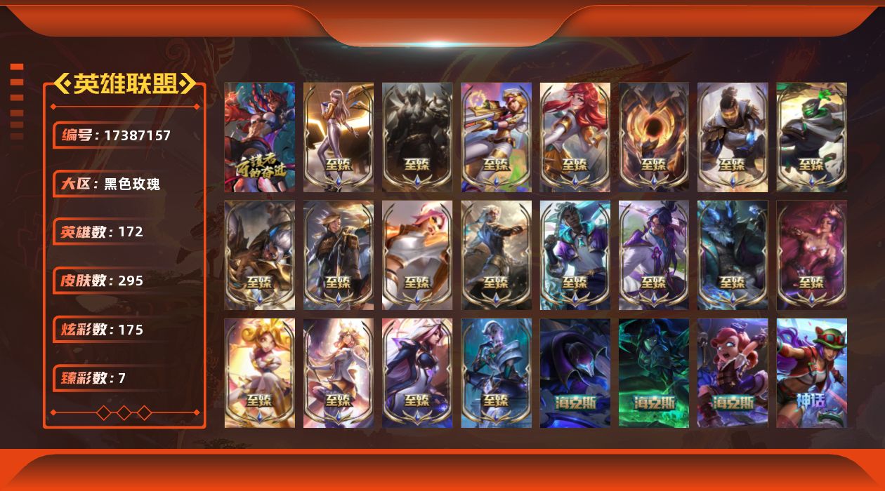 [17387157]【特价出售/店主推荐】黄金段位-172英雄-295皮肤-175炫彩-1终极-24神话-34限定-44传说-54史诗