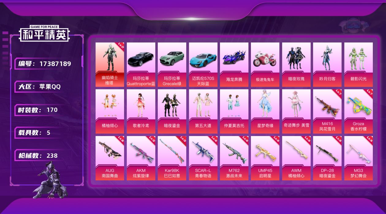 - [17762362]安卓 手Q-8粉装-9特效枪-4载具-1粉色飞行器-55350热力值-11王牌印记-123套装-168枪皮 【热门品类】:粉装-缤纷油彩,套装-深海小丑鱼,套装-龟仙人 【粉色套装】:粉装-缤纷油彩,粉装-天禅智恒,粉装-新星烈龙,角色-洛天依,粉装-海盐物语,粉装-薄荷物语,粉装-朗月武圣,角色-樱桃泡泡 【粉色枪皮等级】:SCAR-L-纯梦嫁纱(五级),M416-五爪金龙(六级),GROZA-镜光银凌(五级),AUG-暖羊咩咩(五级),P90-能量风暴(五级),Kar98K-巳巳如意(五级),Mk14-甜梦熊击(五级),AA12-G-萌骑幻想(四级),DP-28-豹影疾电(五级) 【粉色载具】:路特斯ELETRE(冰川蓝),玛莎拉蒂MC20(星石白),玛莎拉蒂Ghibli(粉),海龙奔腾 【粉色枪皮】:SCAR-L-纯梦嫁纱,M416-五爪金龙,GROZA-镜光银凌,AUG-暖羊咩咩,P90-能量风暴,Kar98K-巳巳如意,Mk14-甜梦熊击,AA12-G-萌骑幻想,DP-28-豹影疾电 【粉色飞行器】:闪光银龙飞行器 【粉色降落伞】:梦幻火箭降落伞,夏日绵绵冰降落伞,星夜魔法师降落伞,垂柳戏鸭降落伞,纯梦嫁纱降落伞,圣堂之誓降落伞,时空协奏降落伞,月影灵韵降落伞,星穹咏叹调降落伞,绯穹魔姬降落伞 【稀有套装】:套装-龟仙人,套装-巳巳如意,套装-燕燕于飞,套装-鱼渊荷华,套装-风舞幻音,套装-粉恋花,套装-紫幽梦,套装-蓝冰羽,套装-霓虹热舞,套装-朱霞炽焰,套装-凌霄紫焰 【稀有枪皮】:AKM-影袭,AKM-筑梦精灵,M16A4-幻世战舞者,M16A4-甜心亚梦,SCAR-L-玉兔迎春,SCAR-L-红色方程式,M416-糯团青竹,M416-蓝色火焰,GROZA-懵萌河马,GROZA-田园牧歌,GROZA-青春物语,AUG-天降萌叽,QBZ-彩虹符号,QBZ-飞驰魅影,M762-天降萌叽,M762-奇异狩猎者,M762-暖熊萌萌,M762-橘柚倾心,M762-绒雪飘舞,Mk47-妙红点点,Mk47-洛神天依,G36C-懵萌河马,AC-VAL-天降萌叽,AC-VAL-甜心亚梦,蜜獾-垂柳戏鸭,蜜獾-天降萌叽,蜜獾-娇憨猪猪,ARX-凌霄紫焰,UZI-啾咪啾咪,UZI-天降萌叽,UZI-娇憨猪猪,UMP45-涂山之恋,UMP45-生命誓言,UMP45-蓝色火
