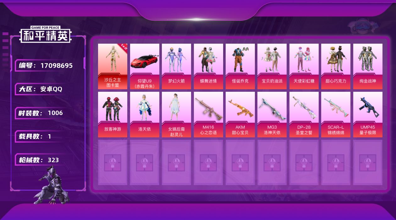 - [15142649]【店主推荐捡漏号!可直接换绑】安卓 手Q-8粉装-9特效枪-2载具-3粉色飞行器-80076热力值-16王牌印记-169套装-251枪皮 【热门品类】:角色-军刀雅典娜,套装-龟仙人 【粉色套装】:粉装-智能音符,粉装-放客神游,角色-初号机款机体服,角色-呆萌星弥,粉装-未来歌姬,角色-千金淑猫,角色-脆鲨七海,角色-冷漠罗丽 【粉色枪皮等级】:AKM-炫紫旋律(五级),SCAR-L-纯梦嫁纱(七级),M416-五爪金龙(七级),Vector-最终圣卫者(三级),P90-电糖天使(三级),Kar98K-巳巳如意(五级),M417-第五大道(六级),DP-28-豹影疾电(五级),破片手榴弹-瓶中星球(七级) 【粉色载具】:最终圣卫者摩托车,辉羽雀灵自行车 【粉色枪皮】:AKM-炫紫旋律,SCAR-L-纯梦嫁纱,M416-五爪金龙,Vector-最终圣卫者,P90-电糖天使,Kar98K-巳巳如意,M417-第五大道,DP-28-豹影疾电,破片手榴弹-瓶中星球 【粉色飞行器】:雀灵庇佑飞行器,终晖之翼飞行器