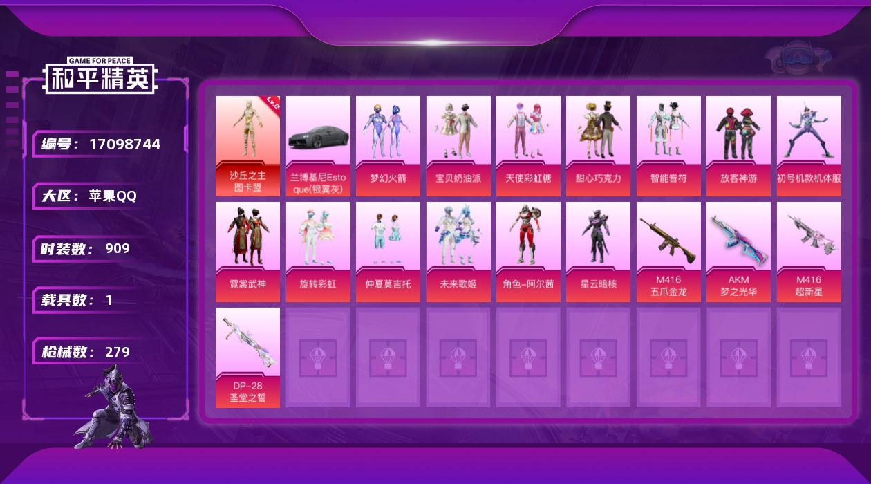 [17098744]【11354986】[11354986]WBDS0060 苹果Q 228套装 279枪皮 1神装17粉装7特效枪1载具 沙丘之主-图卡盟 (2级) M416-超新星 (9级) 兰博轿车灰色 AKM-缤纷海域 AKM-百万伏特 都市猎人 浪漫天命 紫螳螂 梦幻火箭 猪猪侠 绯穹魔姬 暖暖奶龙 宝贝奶油派 天使彩虹糖 甜心巧克力 阿尔茜 未来歌姬 羊梦糖心 星云暗核 霓裳武神 智能音符 放客神游 仲夏莫吉托 旋转彩虹 M416-五爪金龙 (3级) P90-沙丘之主 (3级) Kar98K-巳巳如意 (5级) DP-28-豹影疾电 (5级) AUG-圣斗士星矢 (4级) AKM-梦之光华 (7级) 繁龙极客飞行器 镜光幻境飞行翼 龟仙人 雪山精英 呆萌铁蟹 鹰眼刺客 暗夜行者 深海小丑鱼 胖达团团 暗影哥特 团圆交子 瑞龙福将 忍者信条 水银刺客 狂沙舞者 漫步者 破蛋小黄鸡 军刀雅典娜 弄潮海豚 M762-瑞龙福将 Vector-风花雪月 梦幻火箭头盔 甜心宝贝头盔 幻影战神头盔 深海小丑鱼头盔 梦幻火箭背包 甜心宝贝背包 百万伏特背包 幻影战神背包 萌熊伴侣背包 深海小丑鱼背包
