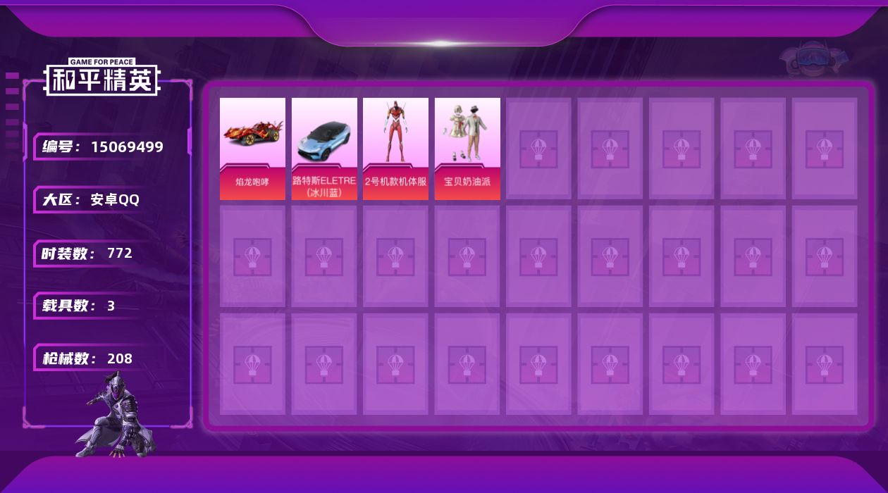 [15069499]【10597692】[10597692]WBDS0020 安卓Q 3车5枪4粉套 16王牌印记 184套装 208枪皮 红螳螂 玛莎拉蒂Q幻星粉(1级) 路特斯EL蓝色 焰龙咆哮 奇异狩猎者 S1赛事外套 AKM-缤纷海域 浪漫天命 宝贝奶油派 星穹咏叹调 粉色回忆 M416-五爪金龙 (6级) Kar98K-巳巳如意 (5级) UZI-筑梦精灵 (4级) AKM-梦之光华 (5级) SCAR-L-青春物语 (4级) 雪山精英 呆萌铁蟹 迅捷狂鲨 深海小丑鱼 大橘为重 SS1特训 团圆交子 瑞龙福将 粉红小猪 狂沙舞者 破蛋小黄鸡 极速红龙 军刀雅典娜 AKM-奇异狩猎者 M762-奇异狩猎者 M762-瑞龙福将 M24-奇异狩猎者 S686-奇异狩猎者 甜心宝贝背包 萌熊伴侣背包 深海小丑鱼背包 营地ID:762869023