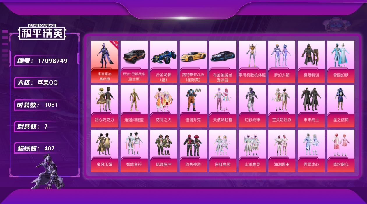 - [11685211]2粉装 4特效枪 10印记 可二次 可修改实名 优质装备:奇异狩猎者,AKM绿萝繁花,SCAR-L-锦绣绵绵,UMP45量子极限,萨利娅,Kar98K-巳巳如意 热门装扮:圣堂之誓,软萌银虎 五级特效枪:五级UMP45-量子极限,五级Kar98K-巳巳如意,五级SCAR-L-锦绣绵绵,五级AKM-绿萝繁花 紫色装扮:田园牧歌,轻风白浪,SS22特训,SS23特训,娇憨猪猪,梦幻奶油,萌趣咩咩,SS21特训,SS31特训套装,人气偶像,冰川特警,冷焰舞者,极速光影,SS30特训套装,SS33特训套装,青涩时光,顶瓜瓜,SS20特训,都市漫游者,都市魅力,长空猛禽,霓虹街区,缤纷果语,耀眼新星,荣耀,荧惑魅影,蓝彩潮人,蓝色运动,街头潮人,魅力单车,麻辣教官,黄色伏地魔,黄色名流,黄色运动,黑色伏地魔,龙的传人,冰河战士,龙魂突击队,蝶变,海岛探路者,涂山之恋,完美偶像,帅气教官,幻世战舞者,战地督导,探宝勇士,湖蓝色名流,绮丽涂鸦,白色伏地魔,破晓战魂,破蛋小黄鸡,空岛之星,竞技达人朋克,王牌教练,灼焰舞者,猛禽,SS29特训,米开朗基罗,星途旅人,白光莹,纯真浪花,热情海星,SS28特训,鱼渊荷华,燕燕于飞,巳巳如意,惊鸿侠骨,神气柴柴,懵萌河马,SS24特训(SS24特训套装),萤火魅影(套装-荧惑魅影),SS25特训,元气发射,锦衣飞扬,焰鹰斗篷,幻羽潜行,SS27特训,明鸳圣池,金羽特工,SS26特训,春光漫游,快闪甜心,大橘大利,智慧之神,SS32特训服(SS32特训套装),绯格组合,糖霜甜心,金耀舞者,蓝调潮人,光之冒险 优质战备:圣堂之誓降落伞,创世·救赎降落伞,精灵梦叶罗丽降落伞,星途旅人降落伞,江南烟雨降落伞,星之彼岸降落伞,幻彩电音降落伞,幻星舰长飞行器,彩虹甜喵降落伞,幻影战神降落伞