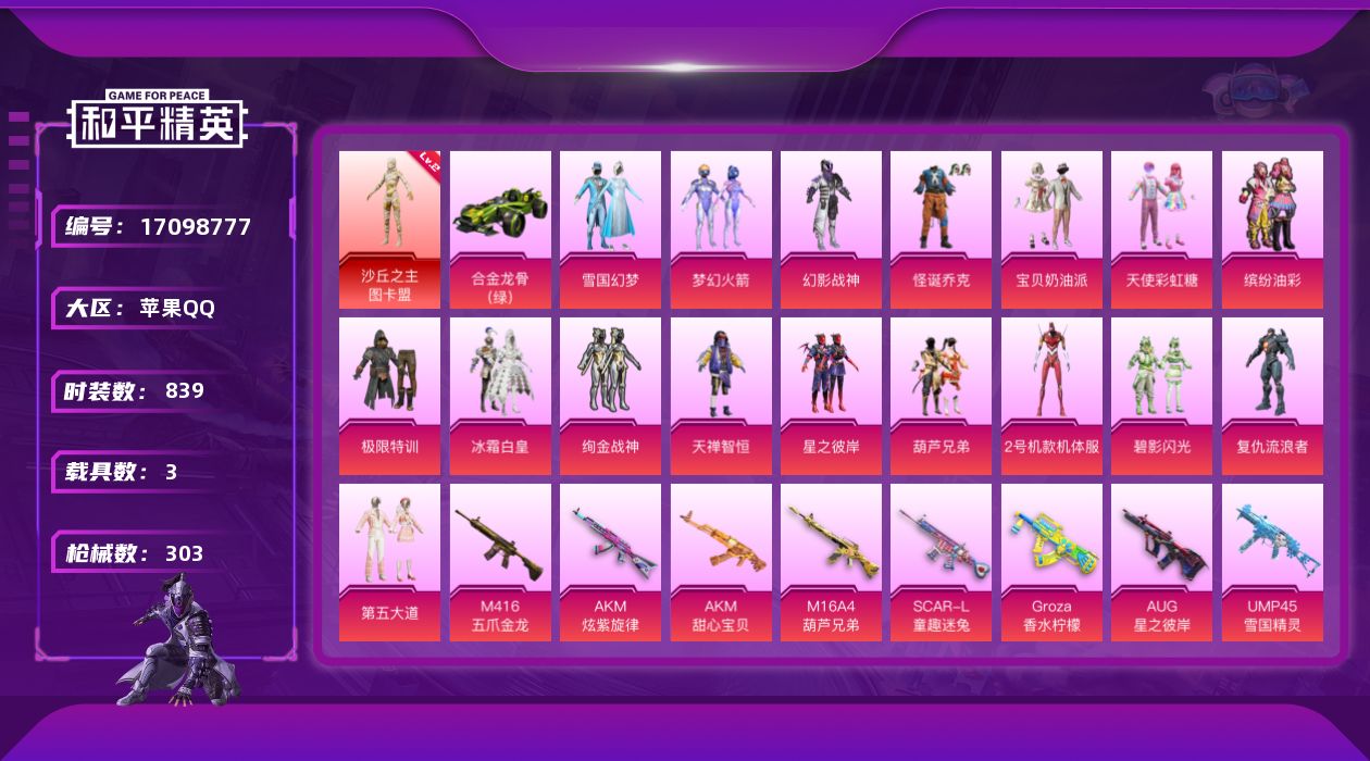 [17098777]【11232194】[11232194]WBDS0055 苹果Q 历史无敌战神 217套装 303枪皮 1神装18粉装21特效枪3载具 沙丘之主-图卡盟 (2级) 木乃伊 红螳螂 M416-五爪金龙 (6级) 玛莎拉蒂粉色 合金龙骨绿色 护世瑞兽 奇异狩猎者 巡查衣 赤蝎幽灵 AKM-缤纷海域 AKM-百万伏特 都市猎人 派对舞王 派对舞王(金靴子) 梦幻火箭 雪国幻梦 猪猪侠 宝贝奶油派 天使彩虹糖 怪诞乔克 幻影战神 缤纷油彩 极限特训 第五大道 天禅智恒 绚金战神 冰霜白皇 星之彼岸 葫芦兄弟 复仇流浪者 碧影闪光 M416-超新星 (3级) P90-沙丘之主 (1级) AKM-甜心宝贝 (6级) AKM-炫紫旋律 (1级) UMP45-雪国精灵 (7级) Kar98K-巳巳如意 (5级) DP-28-豹影疾电 (5级) P90-能量风暴 (4级) MK12-雪月幻音 (1级) GROZA-香水柠檬 (5级) SCAR-L-童趣迷兔 (5级) AUG-星之彼岸 (6级) DP-28-圣堂之誓 (4级) M416-暖熊萌萌 (5级) M416-至情至圣 (2级) MG3-梦幻舞会 (4级) M16A4-葫芦兄弟 (4级) Vector-灵感创作师 (5级) 破片手榴弹-热量炸弹 (7级) 烟雾弹-丁香清露 (4级) 梦幻火箭飞行器 焰龙焚天飞行器 太空嘟嘟飞行器 龟仙人 东方飞龙 动感兔斯基 潮萌小黄鸭 恶魔人蛛 梦魇先生 呆萌铁蟹 万圣娃娃 鹰眼刺客 深海小丑鱼 浪漫波比 WBG追光队服 WBG战队服 暗影哥特 赛罗奥特曼 团圆交子 瑞龙福将 粉红小猪 忍者信条 水银刺客 狂沙舞者 漫步者 冰爽海盐 破蛋小黄鸡 弄潮海豚 M762-瑞龙福将 M24-香水柠檬 梦幻火箭头盔 雪国精灵头盔 甜心宝贝头盔 百万伏特头盔 幻影战神头盔 深海小丑鱼头盔 梦幻火箭背包 雪国精灵背包 甜心宝贝背包 百万伏特背包 幻影战神背包 深海小丑鱼背包