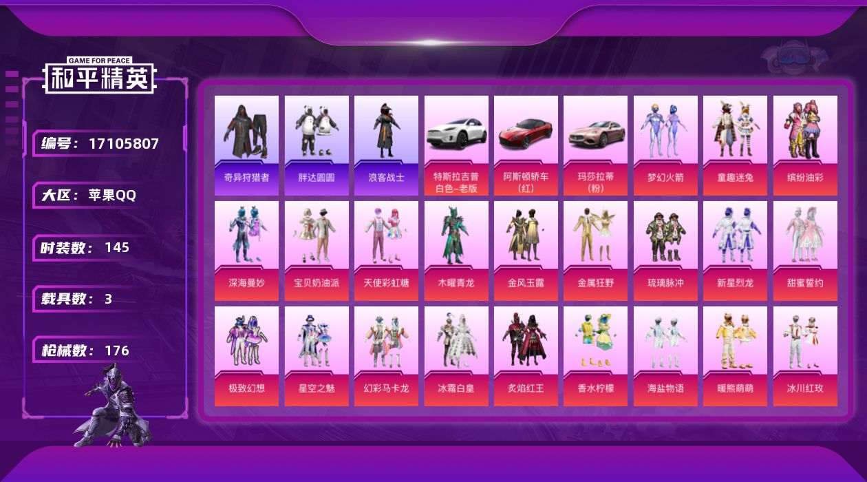 [17105807]【721】苹果 手Q-22粉装-5特效枪-3载具-5粉色飞行器-75186热力值-8王牌印记-145套装-176枪皮