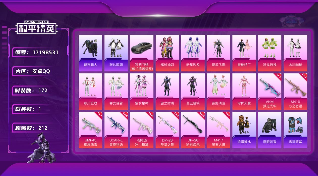[17198531]【736】安卓 手Q-13粉装-8特效枪-1载具-2粉色飞行器-69669热力值-10王牌印记-172套装-212枪皮 【热门品类】:粉装-缤纷油彩,绝对防御上衣,套装-都市猎人,套装-小丑鱼,套装-胖达圆圆,套装-龟仙人,套装-浪漫波比,套装-粉红小猪,角色-Mark.06 【粉色载具】:宾利飞驰(布罗德盖棕双色) 【粉色套装】:粉装-缤纷油彩,粉装-新星烈龙,粉装-飓风飞鹰,粉装-蜜桃特工,粉装-恐龙拽拽,粉装-冰川幽秘,粉装-冰川红玫,粉装-寒光使者,粉装-室女星神,角色-宙之时溯,角色-星云暗核,粉装-莲影清波,角色-守护天翼 【粉色枪皮等级】:AKM-梦之光华(七级),SCAR-L-青春物语(六级),M416-心之恋语(七级),UMP45-相思残雪(七级),汤姆逊-冰川粉黛(六级),M417-第五大道(一级),DP-28-圣堂之誓(五级),DP-28-豹影疾电(二级) 【粉色枪皮】:AKM-梦之光华,SCAR-L-青春物语,M416-心之恋语,UMP45-相思残雪,汤姆逊-冰川粉黛,M417-第五大道,DP-28-圣堂之誓,DP-28-豹影疾电 【粉色飞行器】:太空嘟嘟飞行器,黄族统领飞行器 【粉色降落伞】:甜梦小狐降落伞,绒雪飘舞降落伞,暗夜鎏金降落伞,万古烈焰降落伞,圣堂之誓降落伞,精灵梦叶罗丽降落伞,创世·救赎降落伞,魔童闹海 哪吒降落伞 【稀有套装】:套装-龟仙人 【稀有枪皮】:AKM-2P战斗服款,AKM-墨染幽兰,AKM-彩虹符号,AKM-影袭,AKM-江南烟雨,AKM-破晓战魂,AKM-缤纷海域,AKM-萌趣颜团子,AKM-虎虎生威,AKM-霓虹街区,AKM-龙的传人,M16A4-幻世战舞者,M16A4-甜心亚梦,M16A4-生命誓言,SCAR-L-炫彩节奏,SCAR-L-玉兔迎春,SCAR-L-生命誓言,M416-夜灯,M416-月影鸳鸯,M416-糯团青竹,M416-红色方程式,GROZA-异彩先驱,GROZA-彩虹符号,GROZA-影袭,GROZA-懵萌河马,GROZA-生命誓言,GROZA-田园牧歌,AUG-冰川粉黛,AUG-耀粉歌者,QBZ-彩虹符号,QBZ-未来歌姬,QBZ-洛神天依,QBZ-飞驰魅影,M762-奇异狩猎者,M762-牛气冲天,M762-瑞龙福将,M762-第五大道,Mk47-天之羽翼,Mk47-妙红点点,Mk4