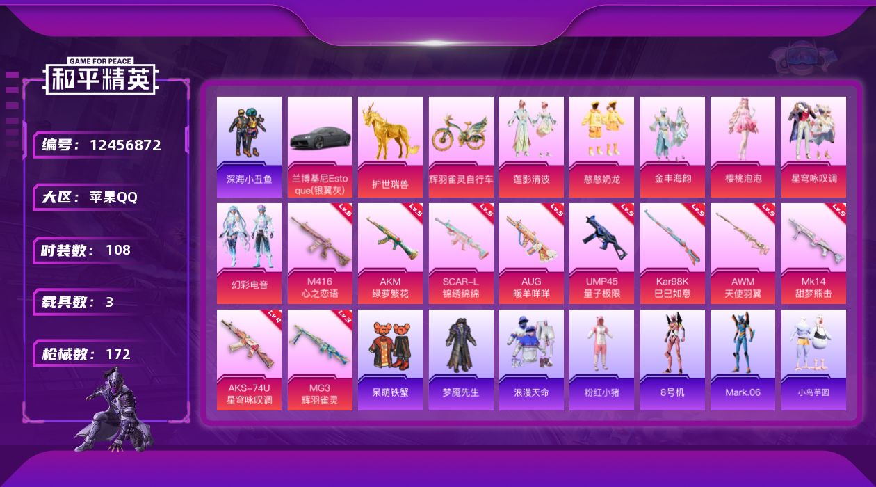 [12456872]【823】苹果 手Q-6粉装-10特效枪-3载具-5粉色飞行器-57592热力值-8王牌印记-108套装-172枪皮 【热门品类】:套装-浪漫天命,套装-深海小丑鱼,套装-粉红小猪,角色-8号机,角色-Mark.06 【粉色载具】:兰博基尼Estoque(银翼灰),护世瑞兽,辉羽雀灵自行车 【粉色套装】:粉装-莲影清波,粉装-憨憨奶龙,粉装-金丰海韵,角色-樱桃泡泡,粉装-星穹咏叹调,粉装-幻彩电音 【粉色枪皮等级】:AKM-绿萝繁花(五级),SCAR-L-锦绣绵绵(五级),M416-心之恋语(六级),AUG-暖羊咩咩(五级),UMP45-量子极限(五级),AKS-74U-星穹咏叹调(四级),Kar98K-巳巳如意(五级),AWM-天使羽翼(五级),Mk14-甜梦熊击(五级),MG3-辉羽雀灵(三级) 【粉色枪皮】:AKM-绿萝繁花,SCAR-L-锦绣绵绵,M416-心之恋语,AUG-暖羊咩咩,UMP45-量子极限,AKS-74U-星穹咏叹调,Kar98K-巳巳如意,AWM-天使羽翼,Mk14-甜梦熊击,MG3-辉羽雀灵 【粉色飞行器】:拂晓神骑飞行器,镜域双华-灵镜之阶,龙翔九天飞行器,圣域金龙飞行器,雀灵庇佑飞行器 【粉色降落伞】:幻影战神降落伞,齐天大圣降落伞,垂柳戏鸭降落伞,闲梦青缨降落伞,炫光之旅降落伞,莲影清波降落伞,猪猪侠降落伞,墨龙九天降落伞,魔法神域降落伞,忍者神龟降落伞,时空协奏降落伞,千金淑猫降落伞,临安公主降落伞,盛世惊鸿降落伞,鬼刀降落伞,幻影飞狐降落伞,樱桃泡泡降落伞,雪月幻音降落伞,圣域龙灵降落伞,星穹咏叹调降落伞,辉羽雀灵降落伞,幻星舰长降落伞,幻彩电音降落伞 【稀有套装】:套装-小鸟芋圆,套装-雏菊兔兔,套装-萝兰蝴蝶,套装-小熊娃娃,套装-糖糖葫芦,套装-青团波波,角色-摩登魅猫,套装-燕燕于飞,套装-鱼渊荷华,角色-风玲,角色-海琴烟,套装-白辉玉蕊,套装-风舞幻音,套装-粉恋花,套装-紫幽梦,套装-蓝冰羽,角色-瑰梦爱神,套装-星影赞美诗,套装-星渊小夜曲,套装-霓虹热舞,套装-极速光影,套装-云朵鹅,套装-雪绒豹 【稀有枪皮】:AKM-彩虹符号,AKM-龙的传人,M16A4-幻世战舞者,M16A4-千金淑猫,SCAR-L-夜灯,SCAR-L-黄金龙骨,SCAR-L-小狗蛇点点,M416-糯团青竹,GROZA-2B战斗服款,