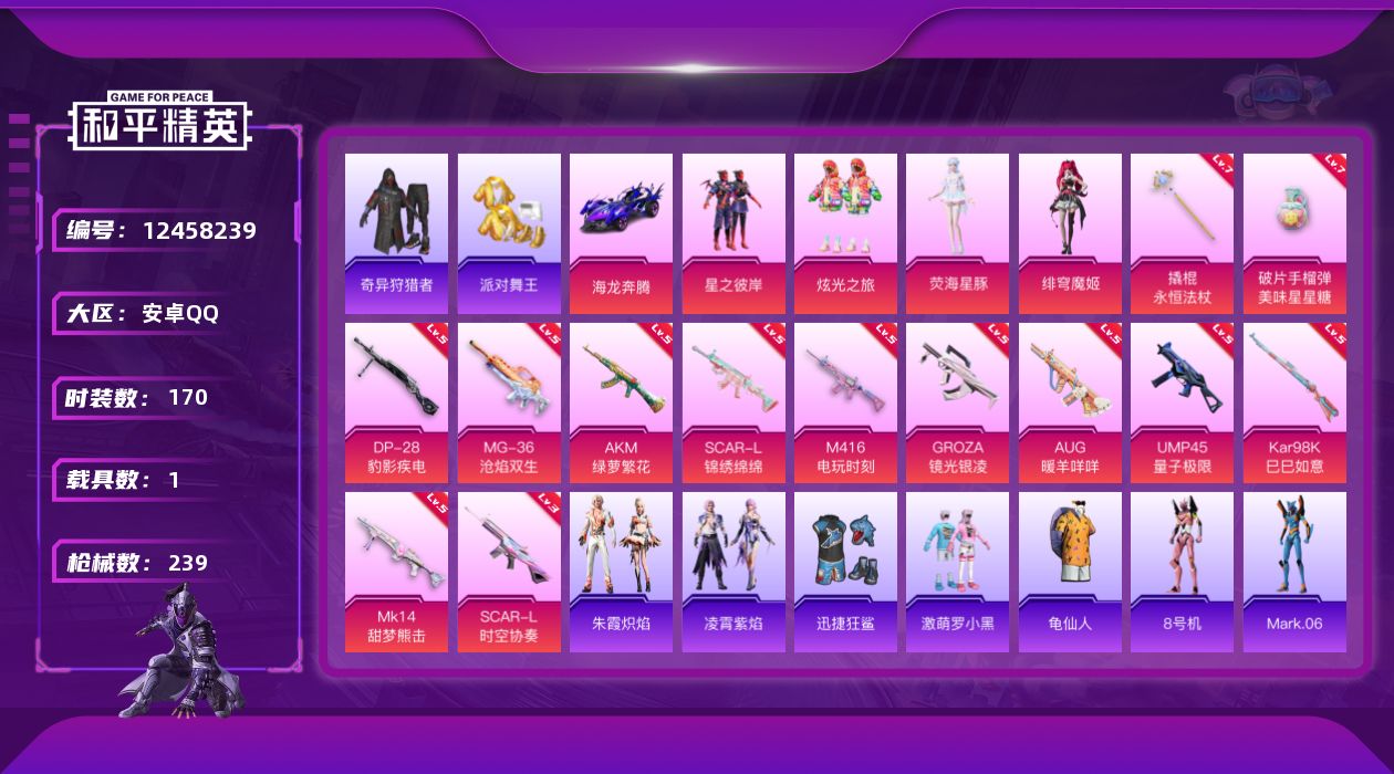 [12458239]【825】安卓 手Q-5粉装-13特效枪-1载具-0粉色飞行器-78172热力值-15王牌印记-170套装-239枪皮