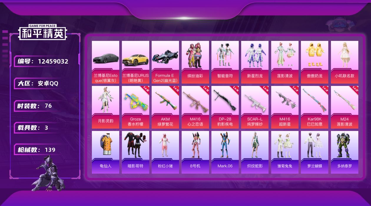 [12459032]【829】安卓 手Q-7粉装-8特效枪-3载具-1粉色飞行器-47737热力值-7王牌印记-76套装-139枪皮 【热门品类】:粉装-缤纷油彩,套装-龟仙人,套装-暗影哥特,套装-粉红小猪,角色-8号机,角色-Mark.06 【粉色载具】:兰博基尼Estoque(银翼灰),兰博基尼URUS(明艳黄),Formula E Gen2(幽光蓝) 【粉色套装】:粉装-智能音符,粉装-缤纷油彩,粉装-新星烈龙,粉装-莲影清波,粉装-傲傲奶龙,角色-小叽联名款,角色-月影灵韵 【粉色枪皮等级】:AKM-绿萝繁花(五级),SCAR-L-纯梦嫁纱(四级),M416-心之恋语(五级),M416-超新星(三级),GROZA-香水柠檬(六级),Kar98K-巳巳如意(三级),M24-莲影清波(二级),DP-28-豹影疾电(四级) 【粉色枪皮】:AKM-绿萝繁花,SCAR-L-纯梦嫁纱,M416-心之恋语,M416-超新星,GROZA-香水柠檬,Kar98K-巳巳如意,M24-莲影清波,DP-28-豹影疾电 【粉色飞行器】:冠军兔兔飞行器 【粉色降落伞】:童趣迷兔降落伞,玉鳞金羽降落伞,莲影清波降落伞,圣堂之誓降落伞,小叽联名款降落伞,蜜语绒猫降落伞,精灵梦叶罗丽降落伞 【稀有套装】:套装-龟仙人,套装-炽纹蛇影,套装-雏菊兔兔,套装-萝兰蝴蝶,角色-多纳泰罗,套装-燕燕于飞,套装-鱼渊荷华 【稀有枪皮】:AKM-夜灯,AKM-龙的传人,M16A4-天使羽翼,M16A4-幻世战舞者,M16A4-莲影清波,SCAR-L-生命誓言,M416-摩登王国,M416-蓝色火焰,GROZA-异彩先驱,GROZA-彩虹符号,GROZA-治愈之星,AUG-天降萌叽,AUG-耀粉歌者,QBZ-彩虹符号,M762-天降萌叽,M762-牛气冲天,G36C-金风玉露,AC-VAL-快闪甜心,蜜獾-天降萌叽,UZI-啾咪啾咪,UZI-天降萌叽,UZI-幻影战神,UZI-红色方程式,UMP45-猪猪侠,Vector-焰鹰斗篷,Vector-彩虹符号,Vector-治愈之星,汤姆逊-天降萌叽,汤姆逊-奇异狩猎者,汤姆逊-幻影战神,汤姆逊-异彩先驱,汤姆逊-环太平洋,汤姆逊-耀粉歌者,MP5K-异彩先驱,P90-快闪甜心,P90-巳巳如意,Kar98K-彩虹符号,Kar98K-炫彩节奏,M24-治愈之星,AWM-焰鹰斗