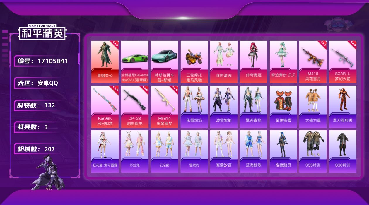 - [13081065]河南一区-47V-2王者-0炫金 【热门武器】:QBZ03-金色蔷薇,M200-竞技荣光,白虎-电玩蓝兔,USP-雷暴,沙鹰-修罗 【音效卡】:擎天-云海游龙音效卡,Barrett-碧霄极光音效卡 【皮肤】:裁决-运输船 皮肤,雷神-宇航兔皮肤,战神-紫绶金章皮肤,战神-流金岁月皮肤 【角色】:电竞教官-云悠悠,云海玲珑,王者葵-惊若翩鸿,零-水下丽影,蜀雪,铁骑荣耀,青霞仙子 【人偶武器】:火麒麟-灵狐,AWM-灵狐-15周年嘉年华,COP-旗袍,迷你超能女侍,迷你深渊冰龙,迷你裂空之翼*2,迷你波特博士*2,迷你牛牛,灵狐娃娃手雷,生化手雷-机甲核心,深渊终结者手雷 【暴走生化】:超级对讲机 【挑战大师】:神圣爆裂者III,冰龙粉碎者-白马银枪,VEPR-12-金魔,激光毁灭者III,试炼破坏者III 【英雄级武器】:AK47-火麒麟,M4A1-雷神,无影-神兵利器,黑武士-锦绣游龙,超新星-热带奇洋,QBZ03-金色蔷薇,AK-47-猩红传说*2,白虎-电玩蓝兔,AWM-裁决,M200-竞技荣光,烈龙-云海游龙,沙鹰-修罗,USP-雷暴,柯尔特-竞技荣光,麒麟刺,擎天-竞技荣光*4,擎天-云海游龙,龙啸-热带奇洋,王者之锋-觉醒版,高爆手雷-竞技荣光*7,手雷-云海游龙,手雷-热带奇洋,高爆手雷-玄豹,闪光弹-竞技荣光*7,烟雾弹-竞技荣光*7,烟雾弹-玄豹 【特殊枪械】: