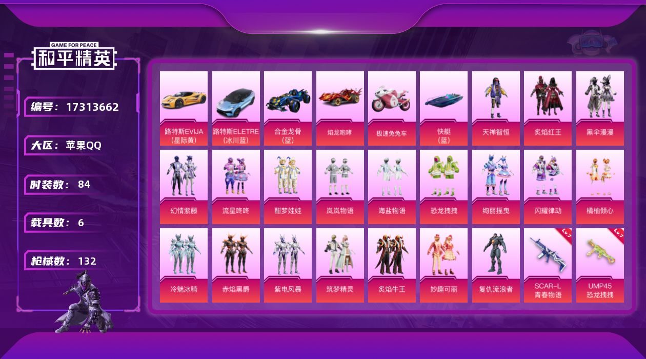 [17313662]【969】苹果 手Q-19粉装-12特效枪-6载具-5粉色飞行器-66664热力值-4王牌印记-84套装-132枪皮