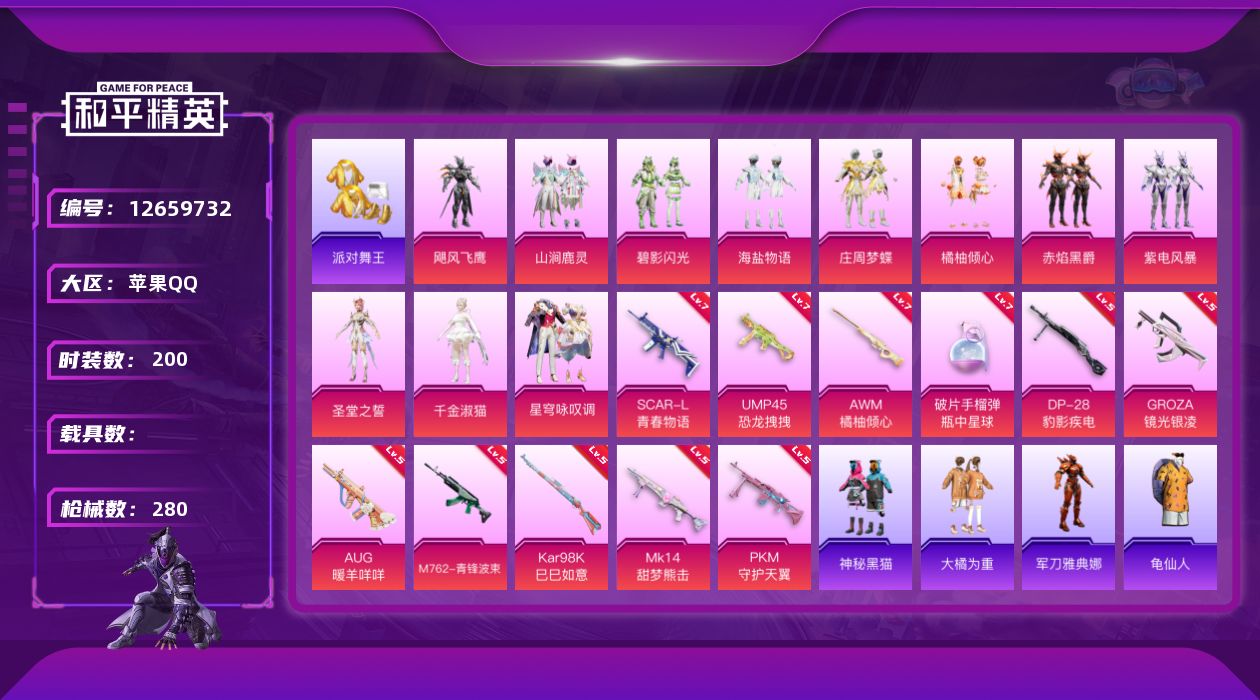 [12659732]【1047】苹果 手Q-11粉装-11特效枪-0载具-4粉色飞行器-94650热力值-16王牌印记-200套装-280枪皮 【热门品类】:套装-派对舞王,角色-军刀雅典娜,套装-龟仙人,套装-粉红小猪 【粉色套装】:粉装-飓风飞鹰,粉装-山涧鹿灵,粉装-碧影闪光,粉装-海盐物语,粉装-庄周梦蝶,粉装-橘柚倾心,粉装-赤焰黑爵,粉装-紫电风暴,角色-圣堂之誓,角色-千金淑猫,粉装-星穹咏叹调 【粉色枪皮等级】:SCAR-L-青春物语(七级),GROZA-镜光银凌(五级),AUG-暖羊咩咩(五级),M762-青锋波束(五级),UMP45-恐龙拽拽(七级),Kar98K-巳巳如意(五级),AWM-橘柚倾心(七级),Mk14-甜梦熊击(五级),DP-28-豹影疾电(五级),PKM-守护天翼(五级),破片手榴弹-瓶中星球(七级) 【粉色枪皮】:SCAR-L-青春物语,GROZA-镜光银凌,AUG-暖羊咩咩,M762-青锋波束,UMP45-恐龙拽拽,Kar98K-巳巳如意,AWM-橘柚倾心,Mk14-甜梦熊击,DP-28-豹影疾电,PKM-守护天翼,破片手榴弹-瓶中星球 【粉色飞行器】:童趣迷兔飞行器,庄周梦蝶飞行器,冷魅冰骑飞行器,千面幻镜飞行器 【粉色降落伞】:深海曼妙降落伞,神秘黑猫降落伞,锦绣火鲤降落伞,银刃赛罗降落伞,林间仙鹿降落伞,蓝莓炮弹降落伞,恐龙拽拽降落伞,庄周梦蝶降落伞,橘柚倾心降落伞,冷魅冰骑降落伞,筑梦精灵降落伞,环太平洋降落伞,歌者泠鸢降落伞,暗夜鎏金降落伞,猪猪侠降落伞,守护天翼降落伞,初号机 觉醒Ver.降落伞,英伦信使降落伞,千金淑猫降落伞,临安公主降落伞,智耀战神降落伞 【稀有套装】:套装-龟仙人,套装-巳巳如意,套装-兰香蝶语,套装-雏菊兔兔,套装-萝兰蝴蝶,套装-小熊娃娃,套装-火种守卫者,套装-糖糖葫芦,套装-青团波波,套装-棉花软糖,角色-许七安,角色-怀庆长公主,套装-燕燕于飞,套装-鱼渊荷华,套装-粉恋花,套装-紫幽梦,套装-蓝冰羽,角色-猎影月神,套装-极速光影,套装-彩虹兔,套装-云朵鹅,套装-雪绒豹,角色-夜瞳黯灵 【稀有枪皮】:AKM-四圣焕新,AKM-夜灯,AKM-奇异狩猎者,AKM-彩虹符号,AKM-恐龙拽拽,AKM-灼热熔岩,AKM-王牌投手,AKM-环太平洋,AKM-虎虎生威,AKM-霓虹街区,AKM-龙的传人,M