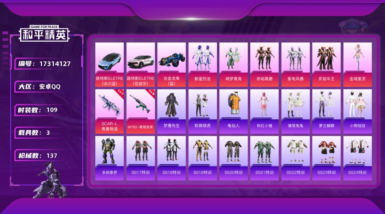 [17314127]【1118】安卓 手Q-6粉装-2特效枪-3载具-1粉色飞行器-43030热力值-10王牌印记-109套装-137枪皮 【热门品类】:套装-龟仙人,套装-粉红小猪 【粉色载具】:路特斯ELETRE(冰川蓝),路特斯ELETRE(花绽灰),合金龙骨(蓝) 【粉色套装】:粉装-新星烈龙,粉装-绮梦青鸾,粉装-赤焰黑爵,粉装-紫电风暴,粉装-炙焰牛王,角色-金域紫灵 【粉色枪皮等级】:SCAR-L-青春物语(七级),M762-青锋波束(五级) 【粉色枪皮】:SCAR-L-青春物语,M762-青锋波束 【粉色飞行器】:百合蜜语飞行器 【粉色降落伞】:荧光虫舞降落伞,绮梦青鸾降落伞,暗夜玫瑰降落伞,碧影闪光降落伞,百合蜜语降落伞,庄周梦蝶降落伞,冷魅冰骑降落伞,圣堂之誓降落伞,金丰海韵降落伞 【稀有套装】:套装-龟仙人,套装-雏菊兔兔,套装-萝兰蝴蝶,套装-小熊娃娃,角色-多纳泰罗 【稀有枪皮】:AKM-冰凉西瓜,AKM-彩虹符号,AKM-灼热熔岩,AKM-生命誓言,AKM-破晓战魂,AKM-虎虎生威,AKM-霓虹街区,AKM-龙的传人,M16A4-幻世战舞者,M16A4-甜心亚梦,M16A4-红色方程式,SCAR-L-炫彩节奏,SCAR-L-玉兔迎春,SCAR-L-红色方程式,M416-夜灯,M416-糯团青竹,M416-红色方程式,M416-蓝色火焰,GROZA-异彩先驱,GROZA-影袭,GROZA-林间仙鹿,GROZA-田园牧歌,AUG-天降萌叽,AUG-耀粉歌者,QBZ-彩虹符号,QBZ-飞驰魅影,M762-天降萌叽,M762-瑞龙福将,Mk47-林间仙鹿,Mk47-洛神天依,G36C-冷魅冰骑,G36C-绮梦青鸾,AC-VAL-天降萌叽,AC-VAL-甜心亚梦,蜜獾-天降萌叽,蜜獾-娇憨猪猪,UZI-天降萌叽,UZI-娇憨猪猪,UZI-影袭,UZI-炫彩节奏,UZI-红色方程式,UMP45-蓝色火焰,Vector-暗夜玫瑰,Vector-生命誓言,Vector-田园牧歌,Vector-百合蜜语,汤姆逊-天降萌叽,汤姆逊-异彩先驱,汤姆逊-炫彩节奏,汤姆逊-环太平洋,汤姆逊-耀粉歌者,MP5K-异彩先驱,P90-飞驰魅影,Kar98K-炫彩节奏,Kar98K-红色方程式,Kar98K-飞驰魅影,M24-影袭,M24-炫彩节奏,M24-百合蜜语,AWM-不夜海上花,