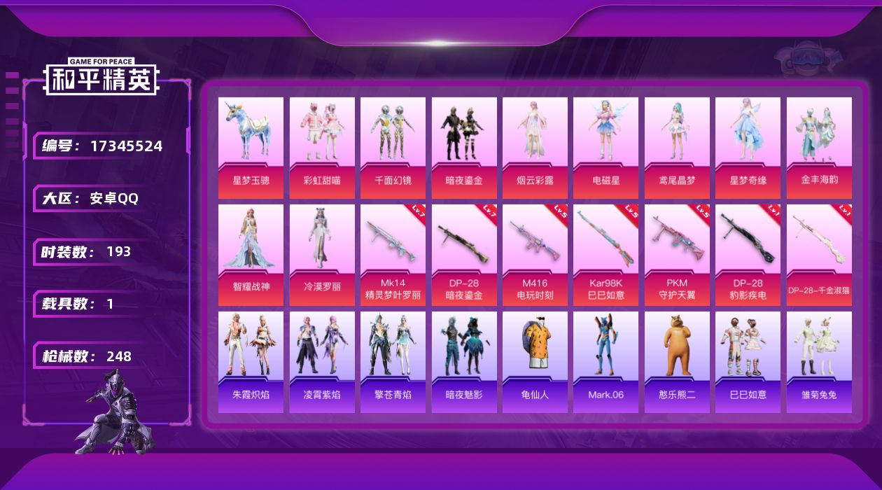 [17345524]【1119】安卓 手Q-10粉装-7特效枪-1载具-3粉色飞行器-82169热力值-15王牌印记-193套装-248枪皮