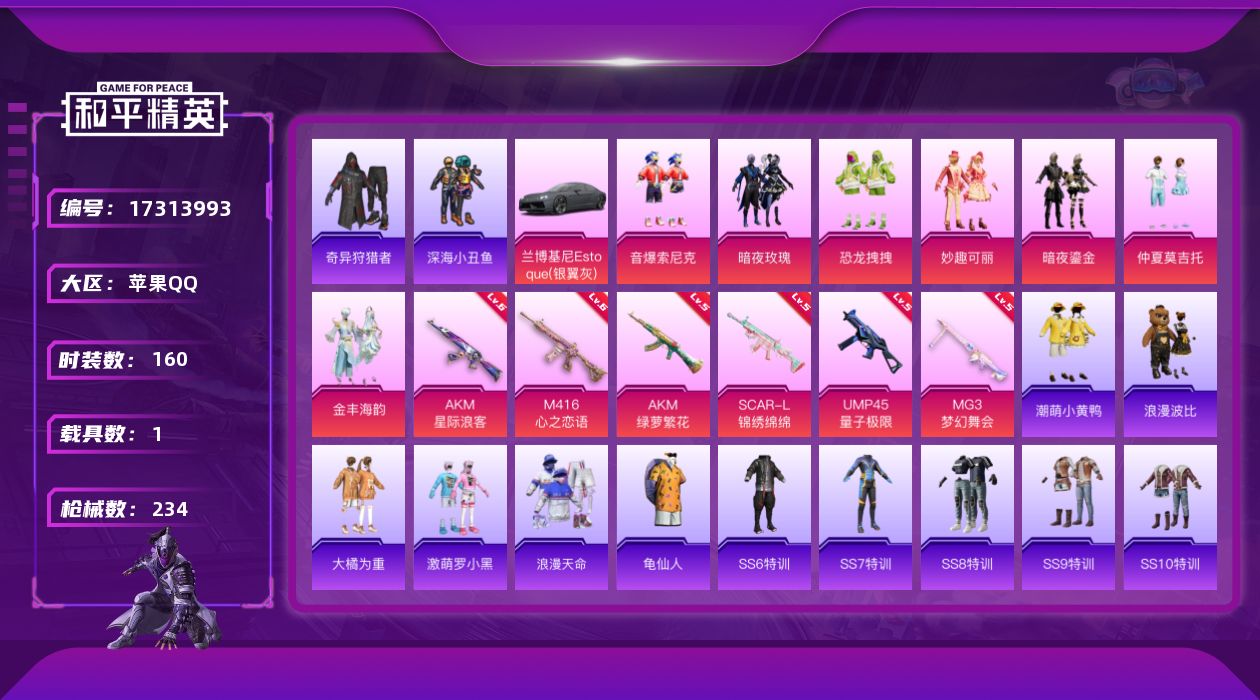[17313993]【1117】苹果 手Q-7粉装-6特效枪-1载具-2粉色飞行器-77687热力值-8王牌印记-160套装-234枪皮