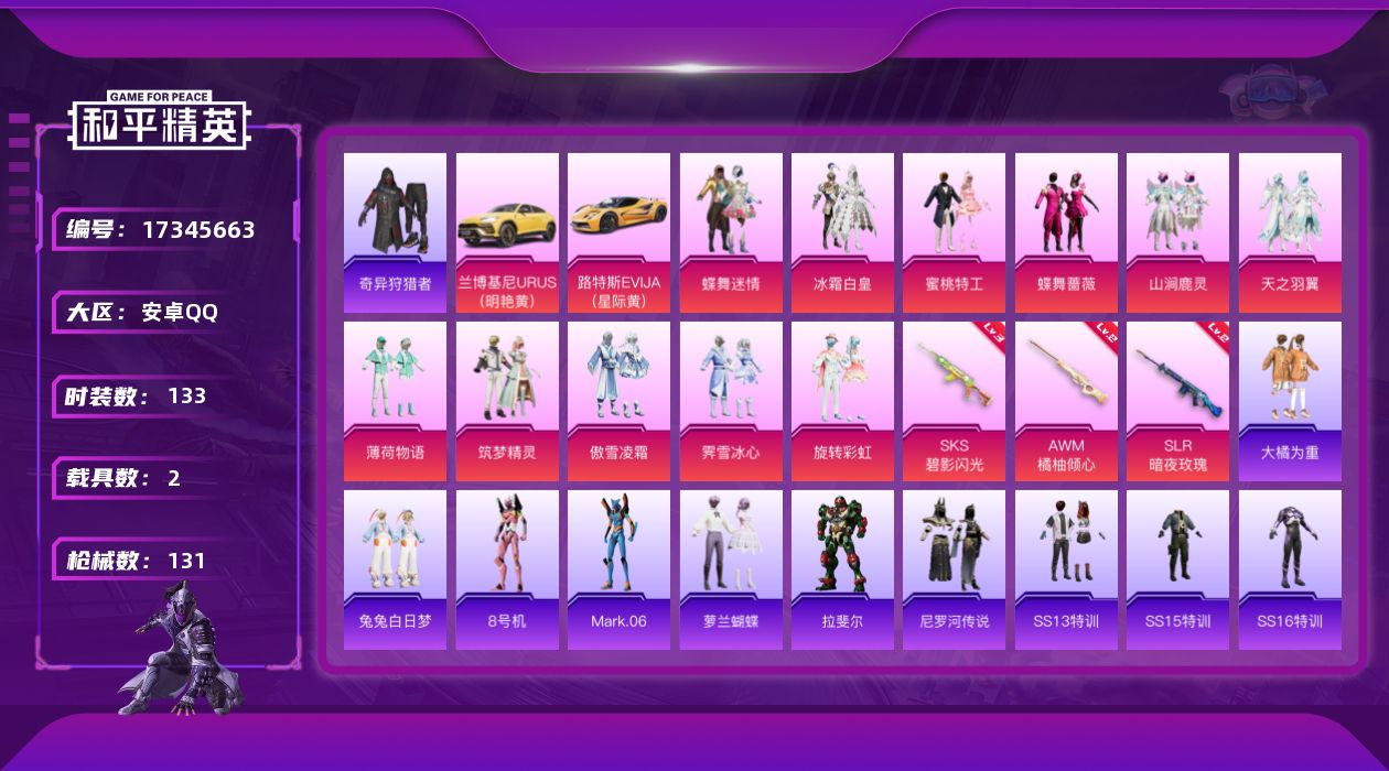 [17345663]【1121】安卓 手Q-11粉装-3特效枪-2载具-2粉色飞行器-49963热力值-3王牌印记-133套装-131枪皮 【热门品类】:套装-奇异狩猎者,角色-8号机,角色-Mark.06 【粉色载具】:兰博基尼URUS(明艳黄),路特斯EVIJA(星际黄) 【粉色套装】:粉装-蝶舞迷情,粉装-冰霜白皇,粉装-蜜桃特工,粉装-蝶舞蔷薇,粉装-山涧鹿灵,粉装-天之羽翼,粉装-薄荷物语,粉装-筑梦精灵,粉装-傲雪凌霜,粉装-霁雪冰心,粉装-旋转彩虹 【粉色枪皮等级】:AWM-橘柚倾心(二级),SKS-碧影闪光(三级),SLR-暗夜玫瑰(二级) 【粉色枪皮】:AWM-橘柚倾心,SKS-碧影闪光,SLR-暗夜玫瑰 【粉色飞行器】:天之羽翼飞行器,翩跹演武飞行器 【粉色降落伞】:甜心宝贝降落伞,神秘黑猫降落伞,暗翼战神降落伞,星之彼岸降落伞,烈焰拳霸降落伞,枪炮玫瑰降落伞,暗夜玫瑰降落伞,天之羽翼降落伞,橘柚倾心降落伞,炙焰牛王降落伞,垂柳戏鸭降落伞,守护天翼降落伞,忍者神龟降落伞 【稀有套装】:套装-萝兰蝴蝶,角色-拉斐尔,套装-尼罗河传说 【稀有枪皮】:AKM-奇异狩猎者,AKM-彩虹符号,AKM-灼热熔岩,AKM-破晓战魂,AKM-萌趣颜团子,AKM-虎虎生威,M16A4-幻世战舞者,M16A4-甜心亚梦,M16A4-蓝色火焰,SCAR-L-暗夜玫瑰,SCAR-L-玉兔迎春,SCAR-L-碧影闪光,M416-红色方程式,M416-蓝色火焰,GROZA-异彩先驱,GROZA-彩虹符号,AUG-天降萌叽,AUG-灵符少年,AUG-耀粉歌者,AUG-青春冒险家,QBZ-彩虹符号,QBZ-暗翼战神,QBZ-神秘黑猫,QBZ-飞驰魅影,M762-奇异狩猎者,M762-枪炮玫瑰,M762-橘柚倾心,M762-瑞龙福将,M762-绒雪飘舞,Mk47-天之羽翼,Mk47-青春冒险家,G36C-古战神甲,G36C-暗夜玫瑰,AC-VAL-天降萌叽,AC-VAL-甜心亚梦,蜜獾-垂柳戏鸭,蜜獾-娇憨猪猪,UZI-娇憨猪猪,UZI-炫彩节奏,UZI-红色方程式,UMP45-生命誓言,Vector-治愈之星,Vector-生命誓言,汤姆逊-奇异狩猎者,汤姆逊-异彩先驱,汤姆逊-炫彩节奏,汤姆逊-耀粉歌者,野牛-青春冒险家,MP5K-异彩先驱,P90-筑梦精灵,P90-飞驰魅影,Kar98K-梦